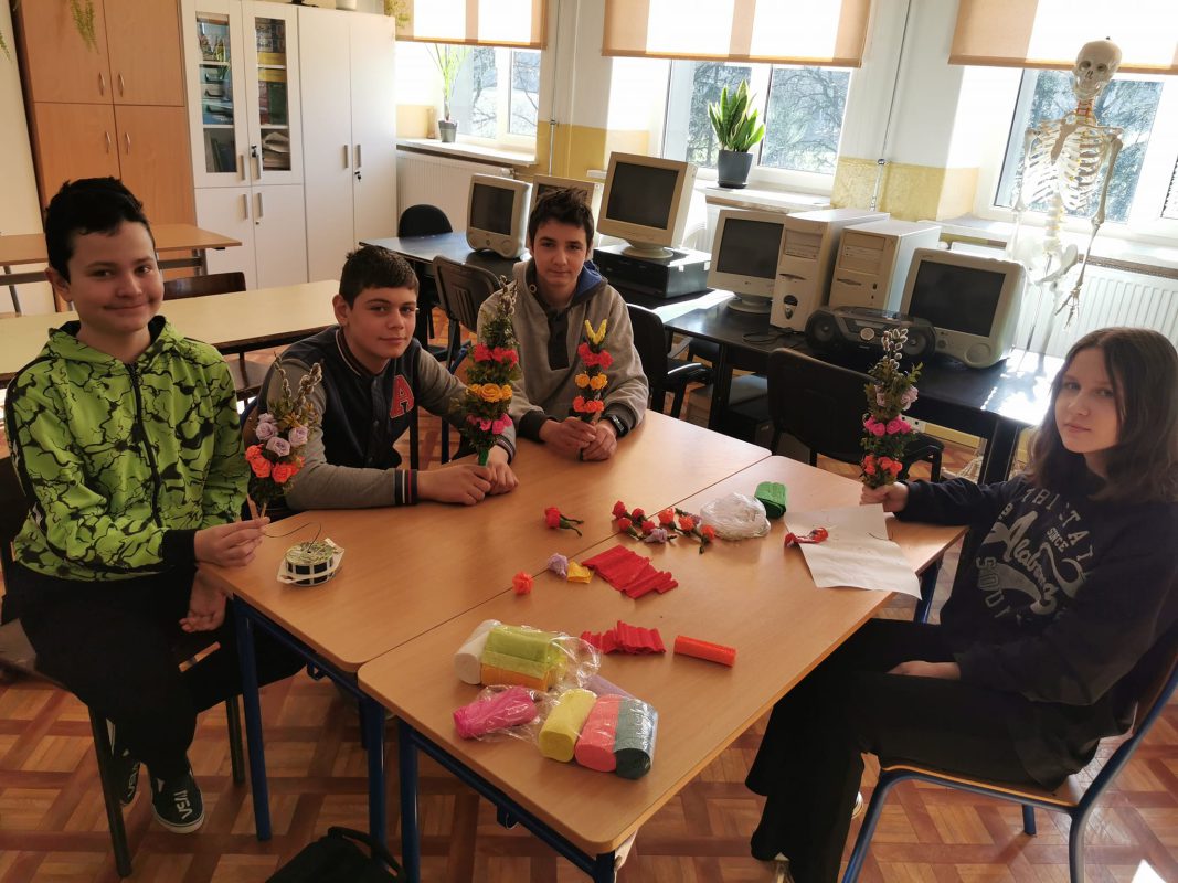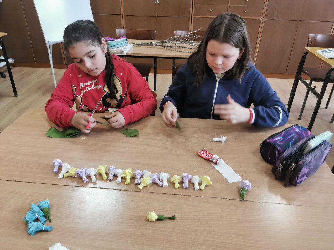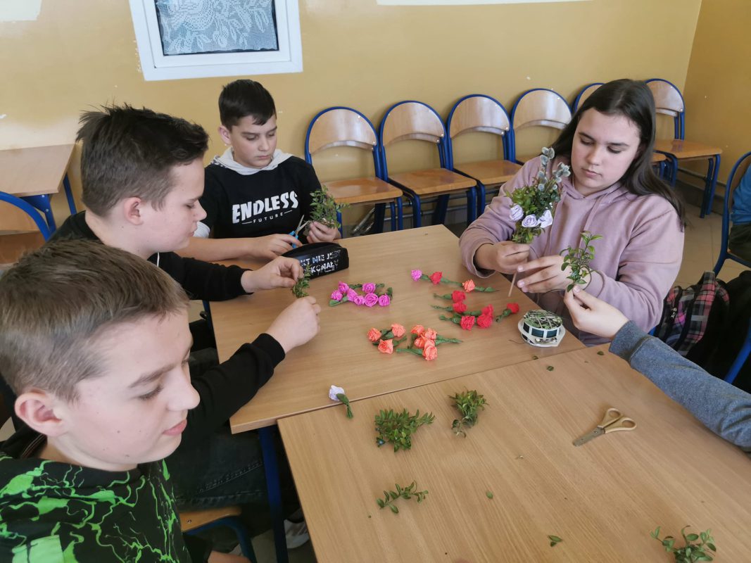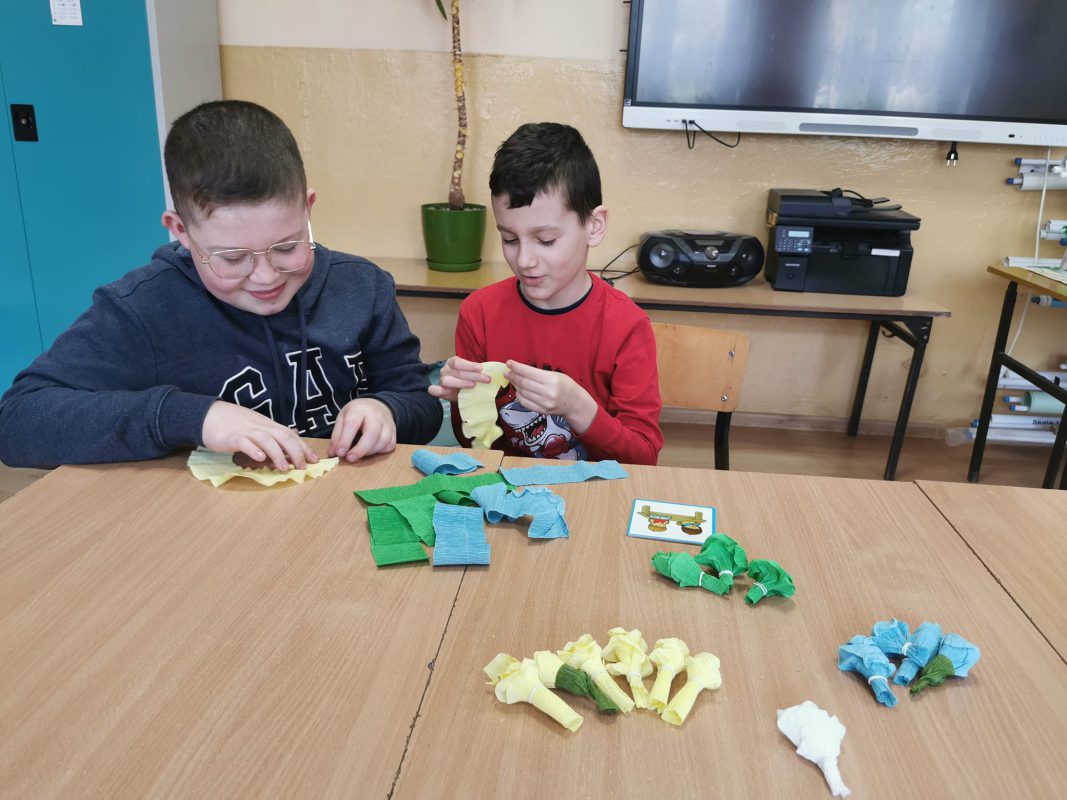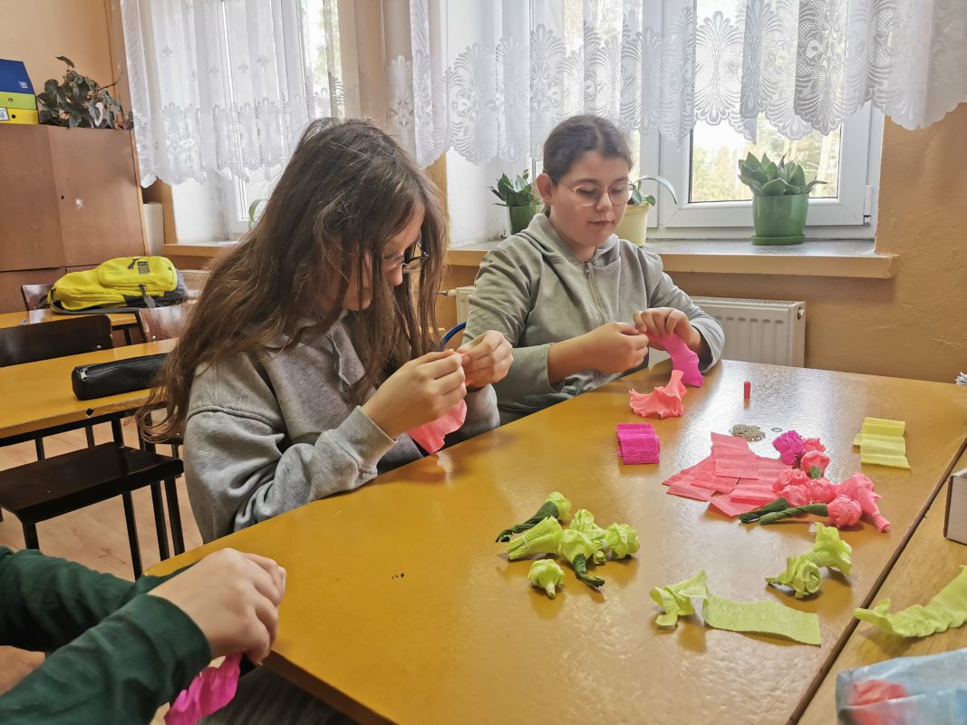 Uczniowie klas IV-VII własnoręcznie wykonali palmy pod okiem pani Agnieszki Mikulskiej. Wszyscy byli bardzo zaangażowani, gdyż akcji przyświeca szczytny cel pomocy ofiarom wojny na Ukrainie. Uczniowie wykazali się dużą zręcznością własnoręcznie wykonując kwiaty z krepiny oraz kreatywnością, zaskakując ciekawymi pomysłami.