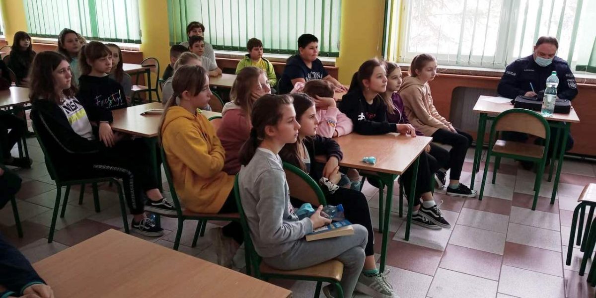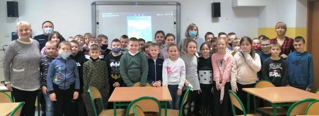 Bezpieczne ferie 2022. Wizyta dzielnicowego w Szkole Podstawowej w Krzynowłodze Małej [ZDJĘCIA]