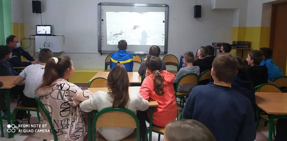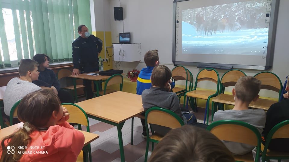 Pan Dzielnicowy omówił zagadnienia związane z bezpieczeństwem podczas zabaw i sportów zimowych i bezpiecznych zachowań na stokach narciarskich. Uświadomił dzieciom zagrożenia związane z wchodzeniem na zamarznięte zbiorniki wodne oraz zasady udzielania i wzywania pomocy w sytuacji, gdy jesteśmy świadkami wpadnięcia do wody w wyniku pęknięcia lodu. Pan policjant przypomniał, że najważniejsze w takiej sytuacji jest wezwanie pomocy – powiadomienie dorosłych i służb ratunkowych. Prelekcja była bardzo kształcąca i wzbogacona pouczającymi prezentacjami, które naocznie zobrazowały zagrożenia.