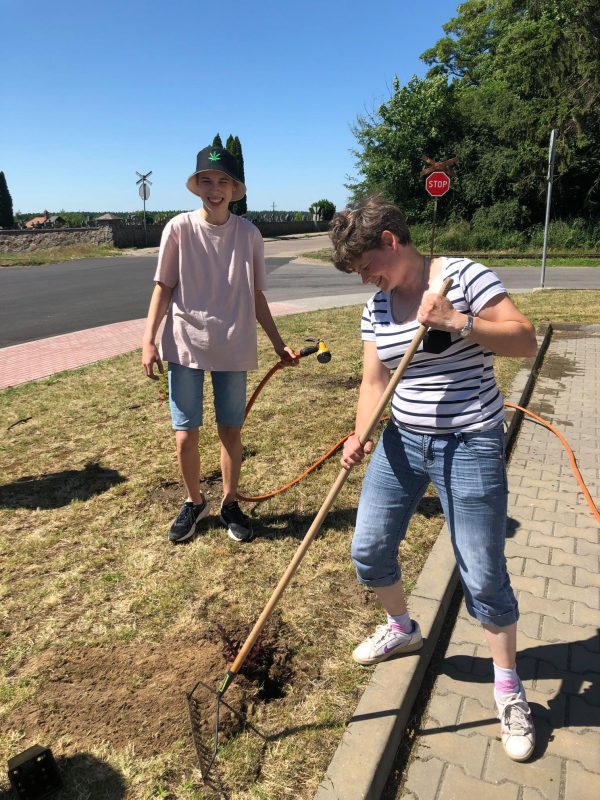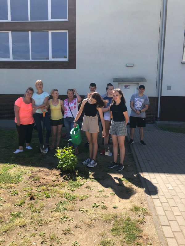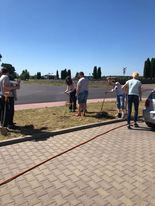 16 czerwca rodzice i uczniowie klasy ósmej, w ramach podziękowania za osiem lat edukacji, obsadzili drzewkami, krzewami i kwiatami teren wokół szkoły oraz boiska szkolnego.