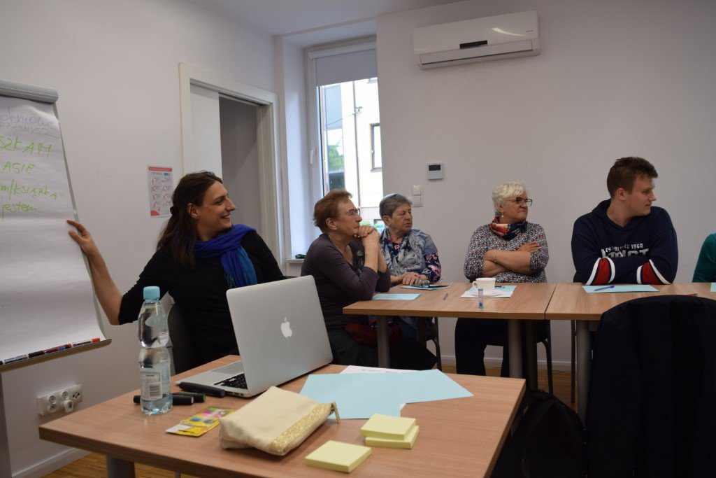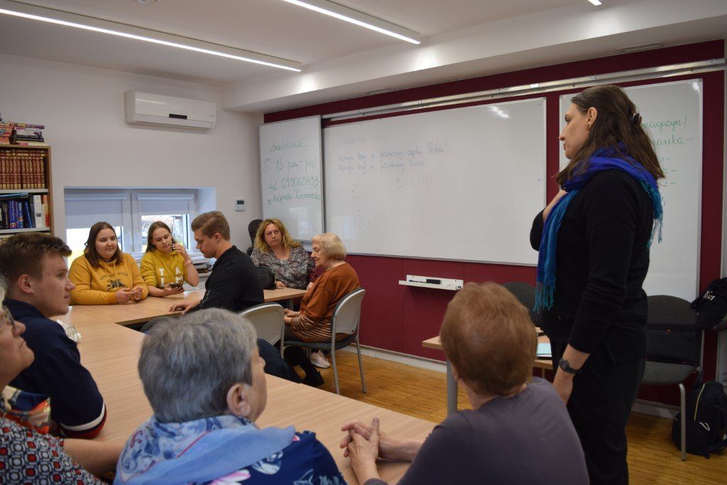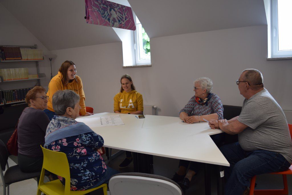 W poniedziałkowe (30 maja) przedpołudnie rozpoczęliśmy cykl warsztatów pn. „Tandem międzypokoleniowy”. Spotkanie prowadziła Martyna Studzińska – doświadczona trenerka, prowadząca działania międzypokoleniowe oraz aktywizujące seniorów.