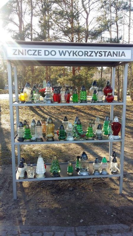 A po co właściwie te stojaki? Mają one służyć: tym, którzy chcą się pozbyć starych szklanych zniczy (bo np. już się nie podobają), tym, którzy nie mają szklanych zniczy, ale mają plastikowe wkłady, nam wszystkim: dzięki temu zamkniętemu obiegowi będzie mniej śmieci w. I trochę więcej zostanie w naszych kieszeniach.