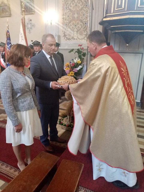 Uroczystego przekazania chleba z tegorocznych zbiorów w imieniu rolników na ręce Wójta Gminy i Przewodniczącego Rady Gminy dokonali Starostowie Anna i Sebastian Pielechowie, po czym odbył się ceremoniał dzielenia chlebem z uczestnikami dożynek.