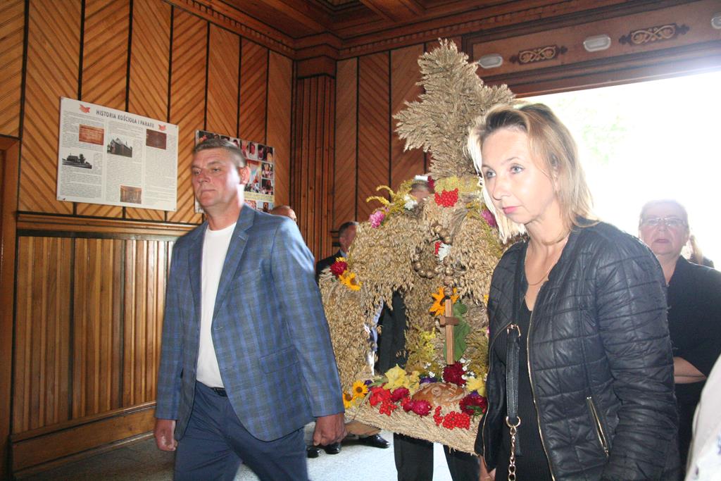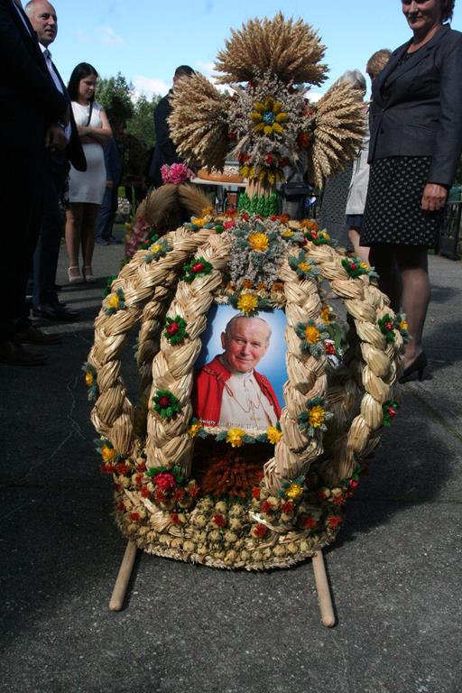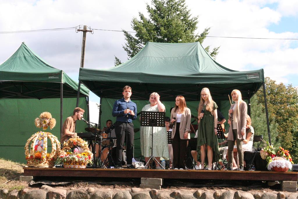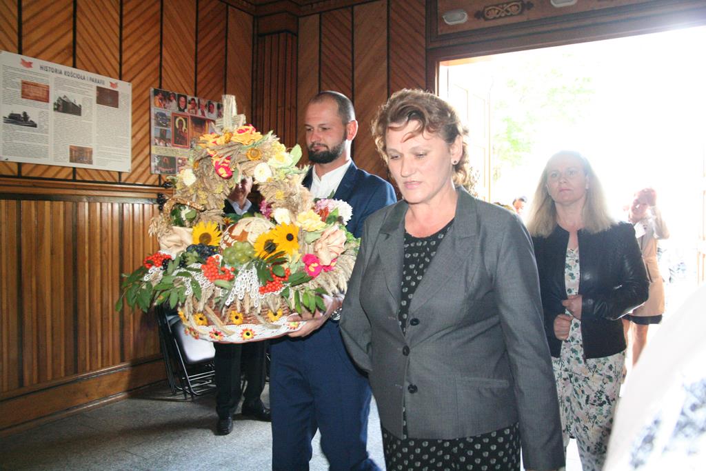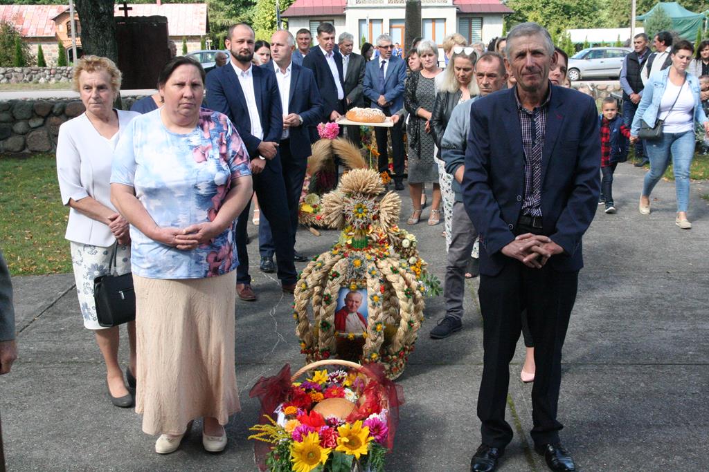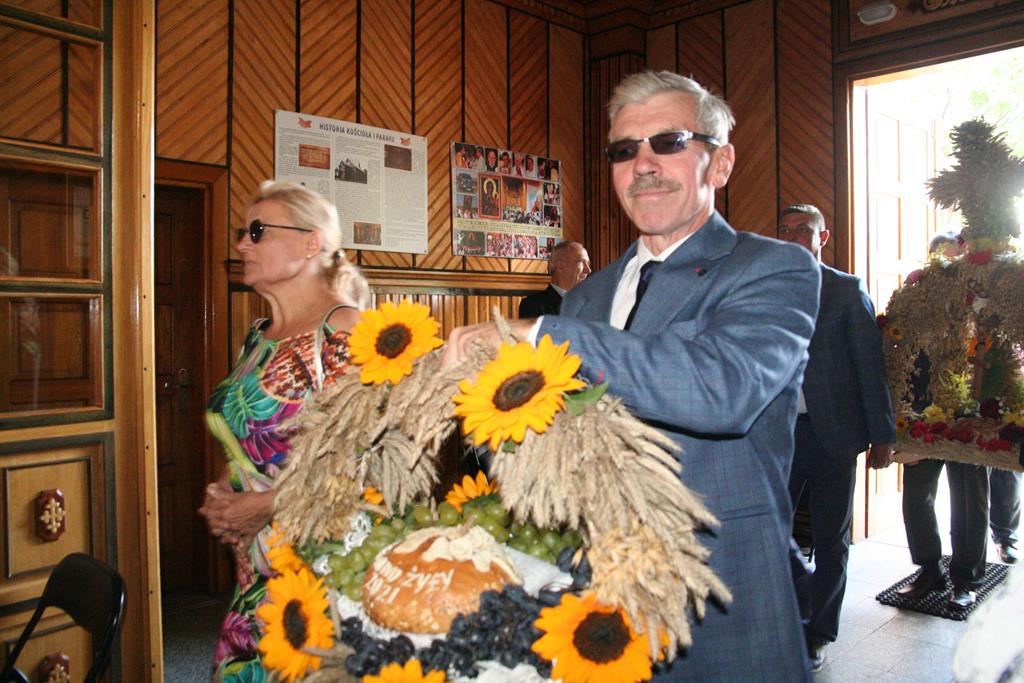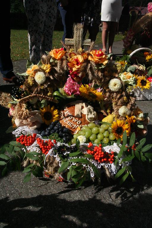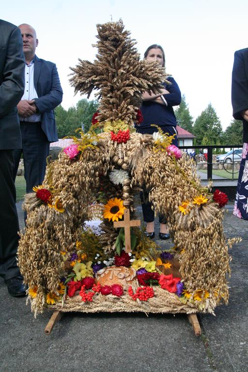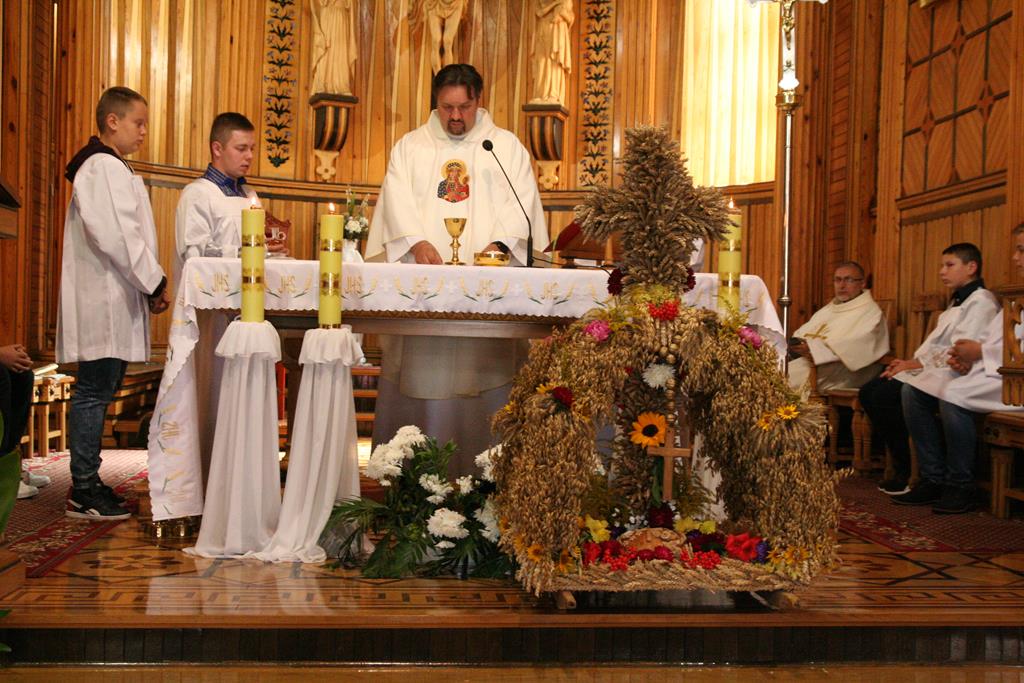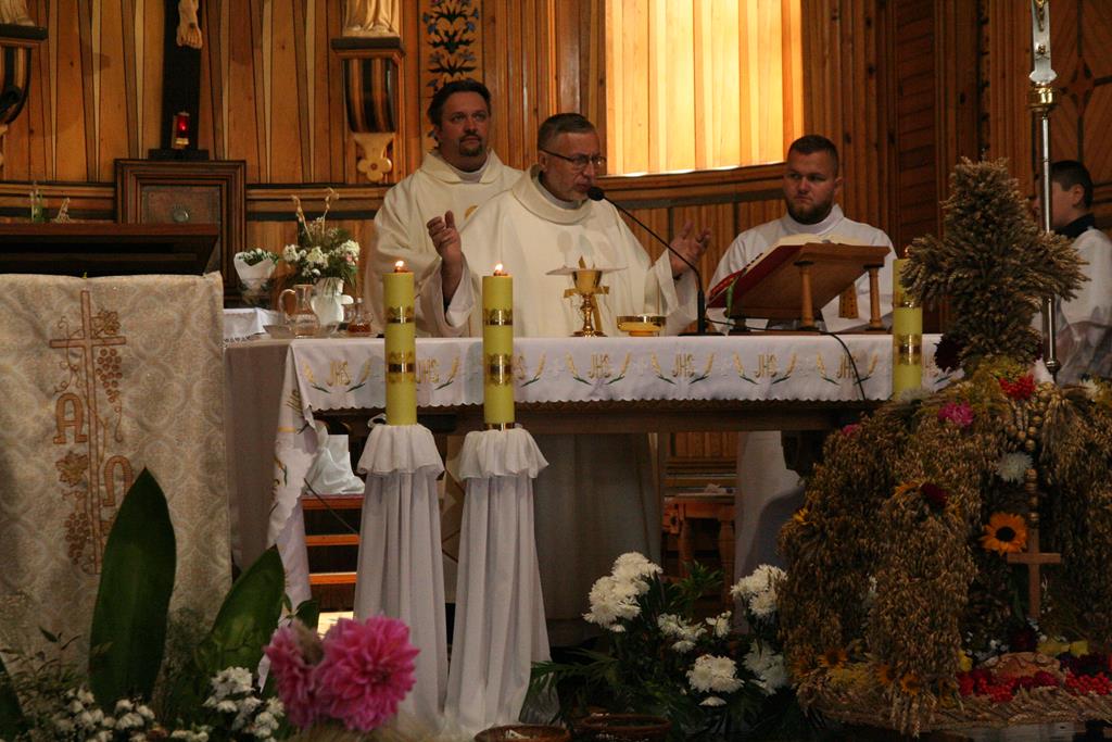 Przed Eucharystią zostały pobłogosławione wieńce i kosze dożynkowe. Uroczystej Mszy świętej przewodniczył i kazanie wygłosił o. Przemysław Śliwiński, dobrze znany w tych stronach pasjonista, który nie tak dawno pracował w Sanktuarium w Przasnyszu.