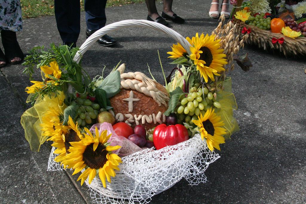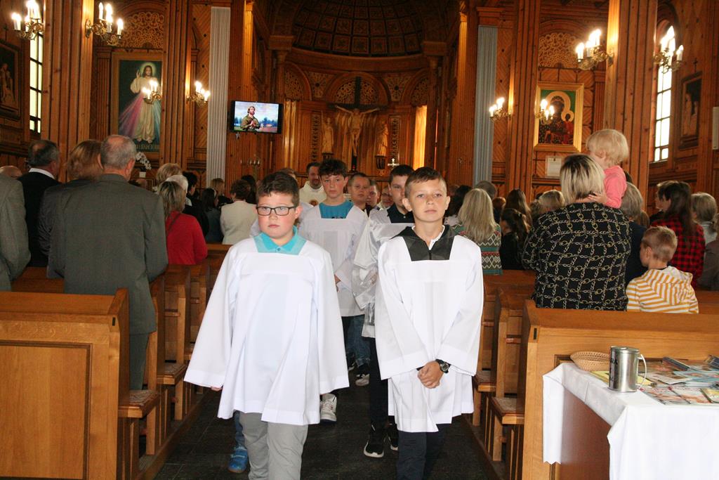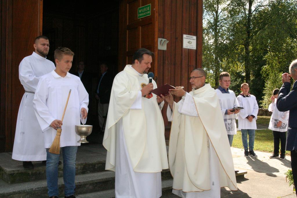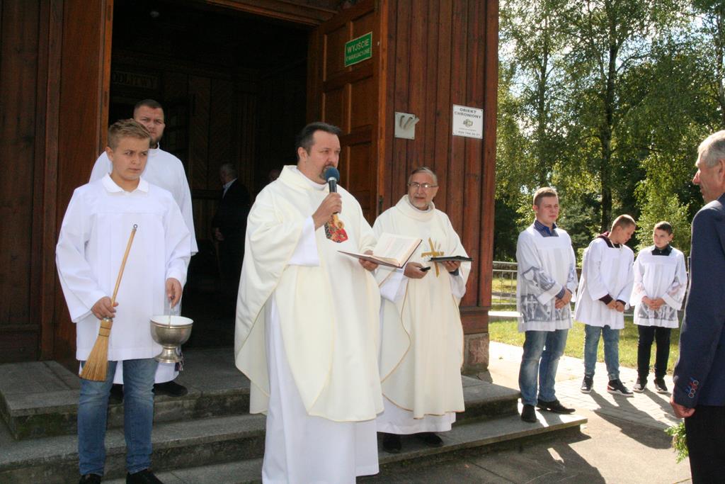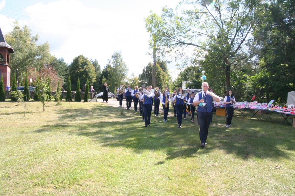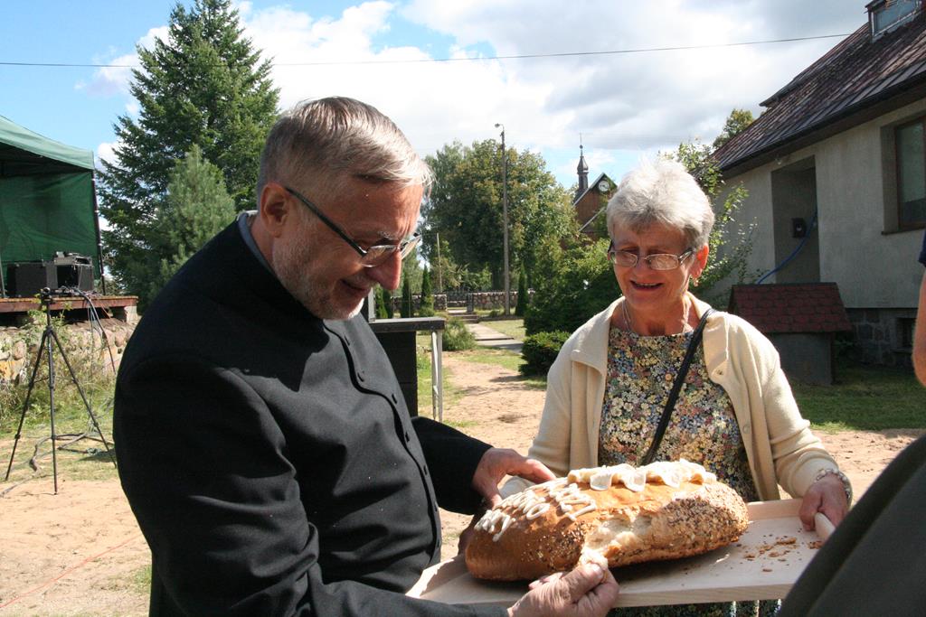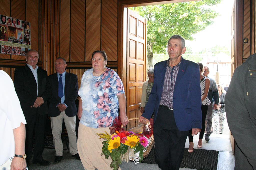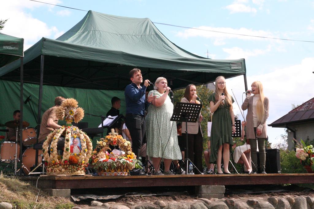 Przed Eucharystią zostały pobłogosławione wieńce i kosze dożynkowe. Uroczystej Mszy świętej przewodniczył i kazanie wygłosił o. Przemysław Śliwiński, dobrze znany w tych stronach pasjonista, który nie tak dawno pracował w Sanktuarium w Przasnyszu.
