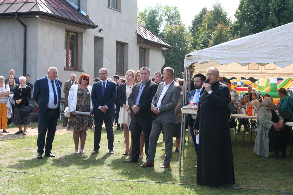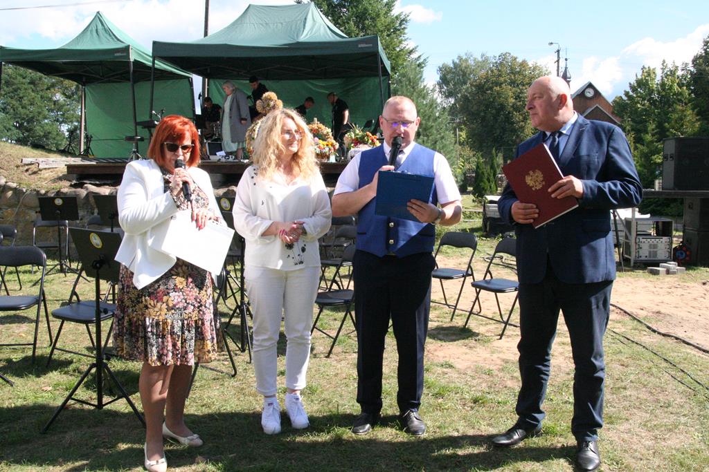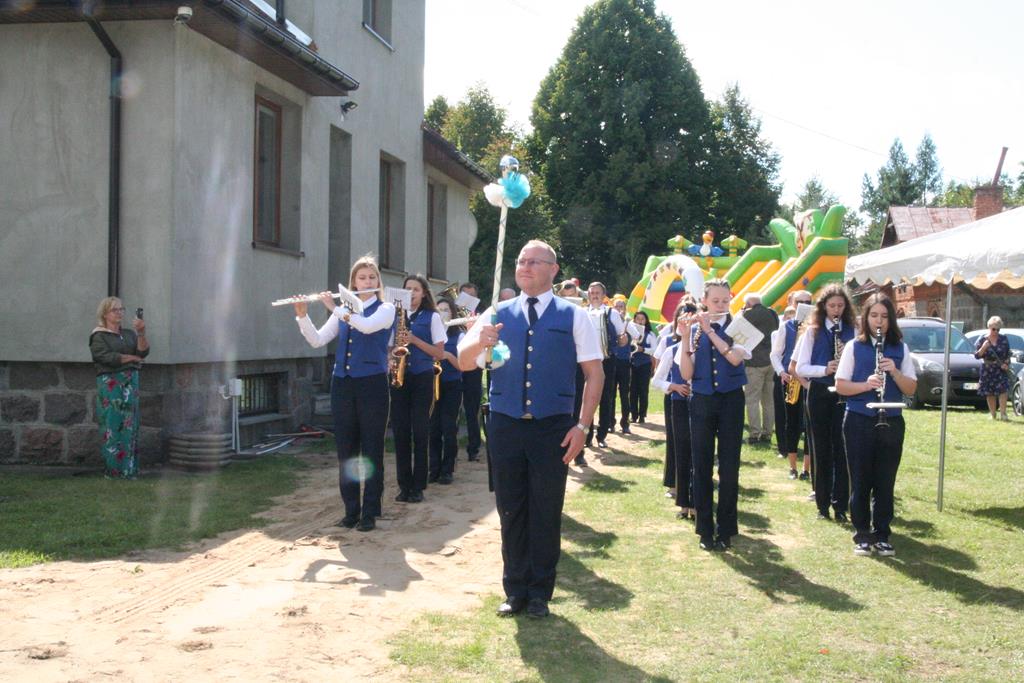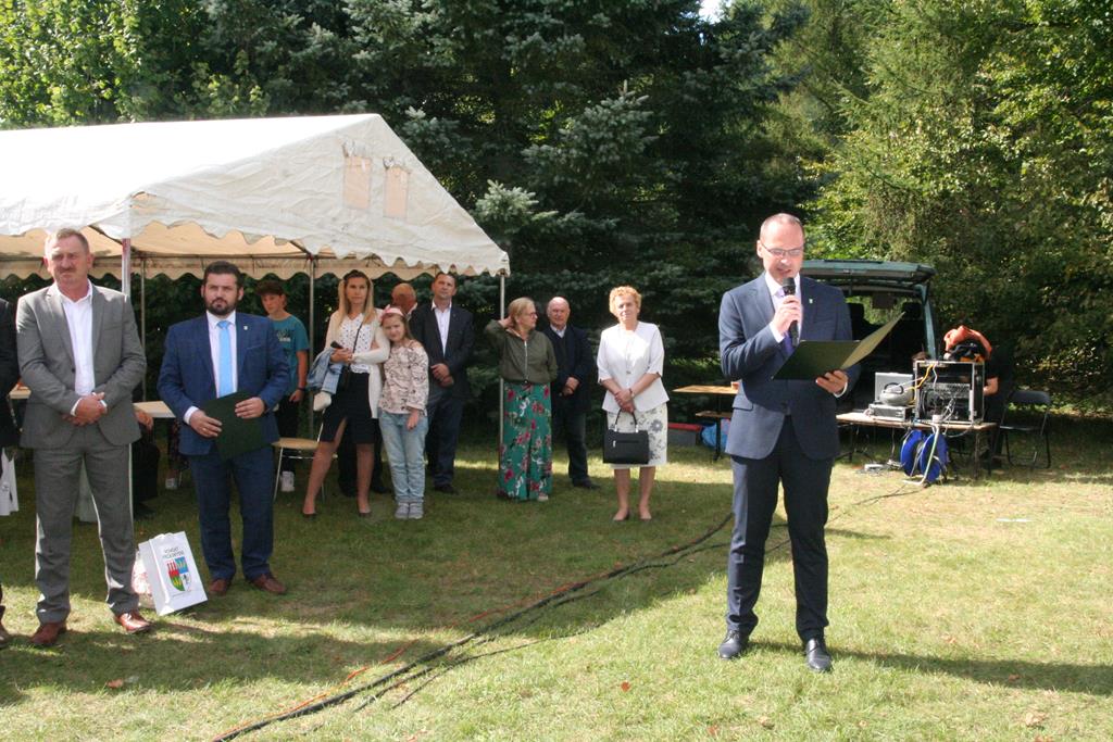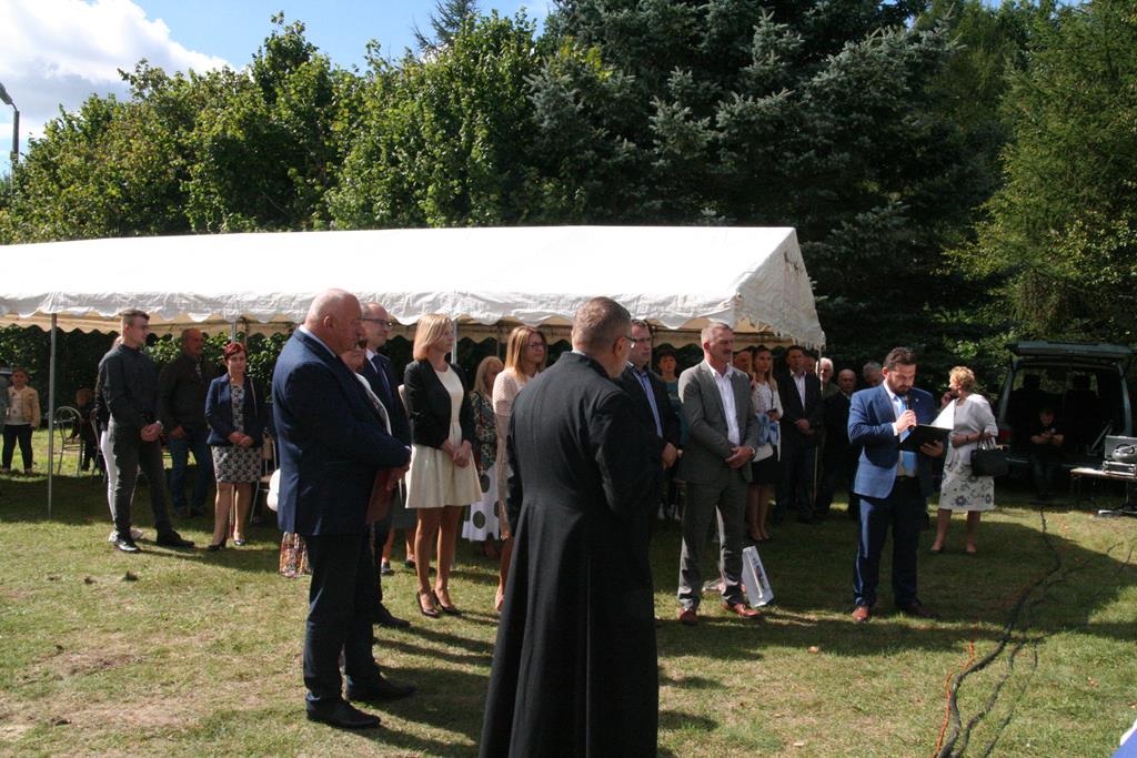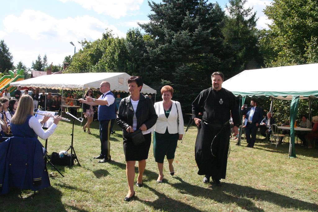 Z Młodzieżową Orkiestrą Dętą z Krzynowłogi Małej korowód dożynkowy przeszedł na teren przy plebanii. Były tu przygotowane namioty, atrakcje dla dzieci, scena koncertowa, powoli rozpalał się grill. Na początek świętowania głos zabrali patroni i sponsorzy, czyli Wójt Gminy Krzynowłoga Mała – Jerzy Humięcki i Wójt Gminy Jednorożec – Krzysztof Iwulski. Głos zabrał również Paweł Mostowy – delegat Starostwa Powiatowego i Starosty Krzysztofa Bieńkowskiego, fundatorzy chodnika dla pieszych na drodze od kościoła do parafialnego cmentarza.