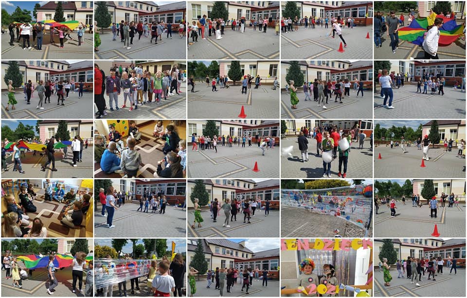 Następnie wszyscy uczniowie udali się na dziedziniec szkoły. Tam odbył się festyn, na którym nie zabrakło nauki tańca (Belgijka, Maya’s Dance, Łowcy gwiazd, Taniec połamaniec), różnorodnych gier i zabaw sportowych. Uczniowie bardzo chętnie brali udział we wszystkich konkurencjach, szczególnie podobały się zawody kowbojskie, podchody, zabawa z bańkami mydlanymi, chustą animacyjną oraz kram malarzy.