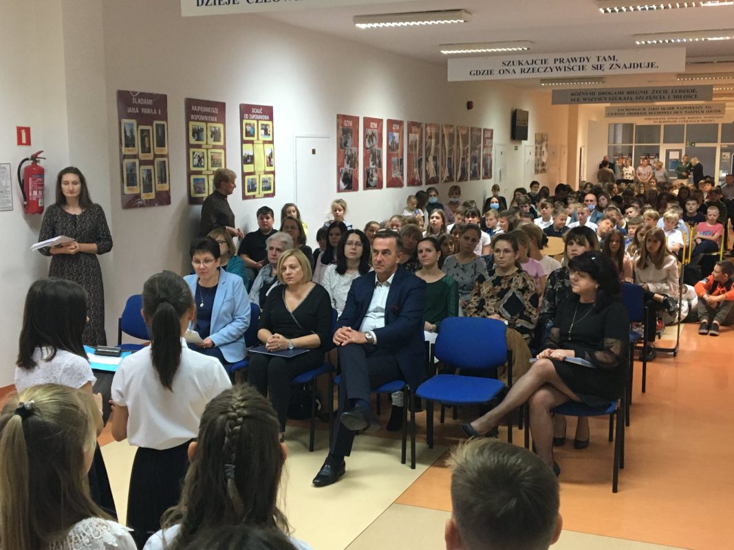 Podczas uroczystego apelu uczniowie podziękowali Dyrekcji, Nauczycielom i Pracownikom naszej szkoły za trudną pracę i okazywane serce. Wyrazem wdzięczności były wiersze, scenki i piosenki.