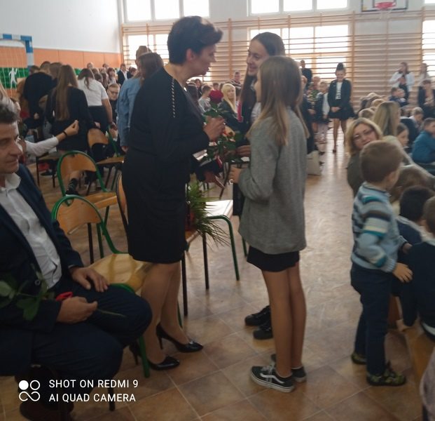 Z uczniowskich serc jak z nut popłynęły słowa wierszy i melodie piosenek wyrażające wdzięczność nauczycielom za codzienny trud ich pracy. Podczas uroczystości głos zabrali również przedstawiciele Samorządu Szkolnego, którzy docenili poświęcenie i troskę pedagogów. Po odśpiewaniu ,,sto lat’’ i wręczeniu kwiatów, Pani Dyrektor Małgorzata Budna oraz Pan Wicedyrektor Włodzimierz Rudziński złożyli serdeczne życzenia Radzie Pedagogicznej oraz wszystkim pracownikom szkoły. Przekazali również podziękowania i symboliczny bukiet kwiatów od Pana Wójta Jerzego Humięckiego i Sekretarz Gminy Pani Anny Leśnik. Wyrazy wdzięczności przekazała także przewodnicząca Rady Rodziców Pani Beata Kuklińska wraz z zarządem RR Panią Magdą Smolińską i Panią Iloną Leleniewską. Uczniowie nie zapomnieli o nauczycielach, którzy już są na emeryturze. Wręczyli im własnoręcznie przygotowane karty z życzeniami.