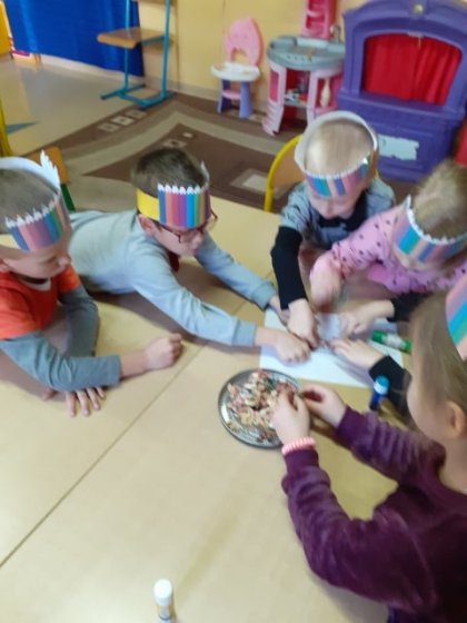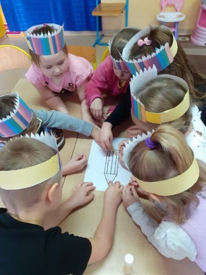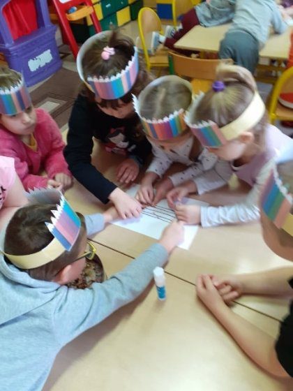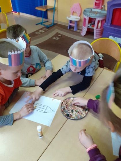 Najpierw dzieci zapoznały się z różnymi rodzajami kredek, potem układały je od najmniejszej do największej i odwrotnie, utrwalały kolory. Wykonały pracę plastyczną z ostrużyn wykleiły kontury kredki. Na koniec wycięły opaskę na głowę z kolorowych kredek i zaśpiewały piosenkę „Kolorowe kredki”.