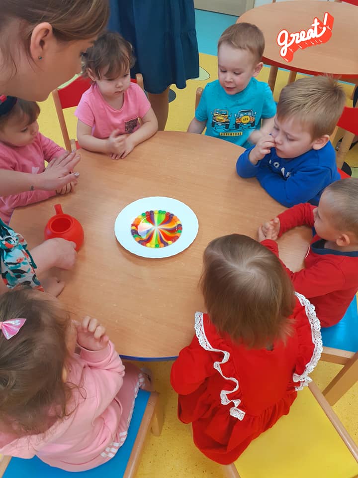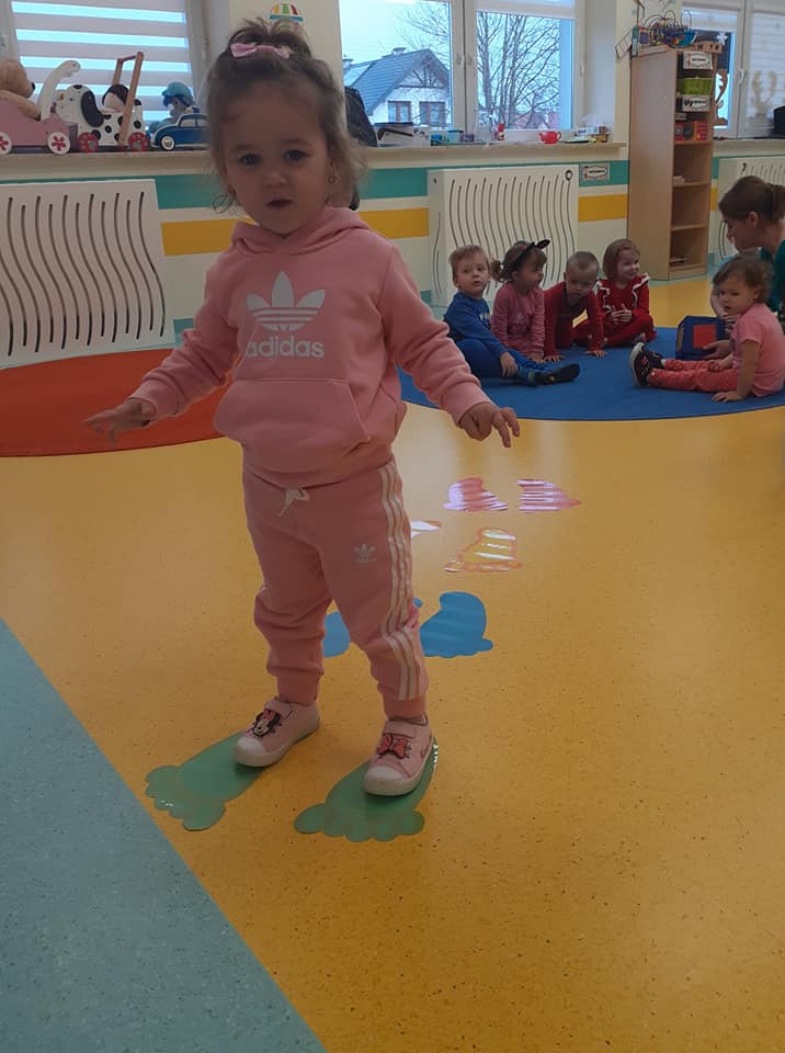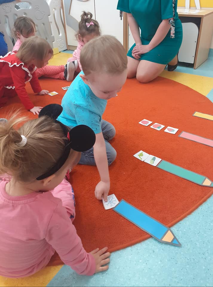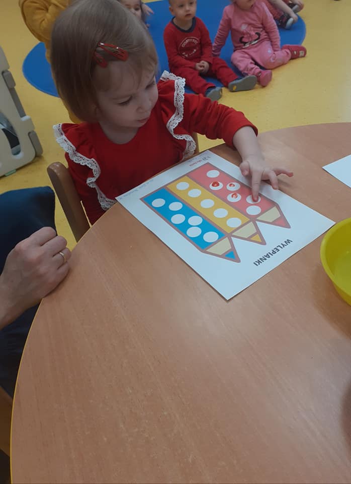 Tego dnia żłobkowicze poznały różne rodzaje kredek, utrwalały znajomość kolorów podczas zabaw oraz zapoznały się z piosenką „Kolorowe kredki”. Na koniec Żabki wykonały pracę plastyczną.
