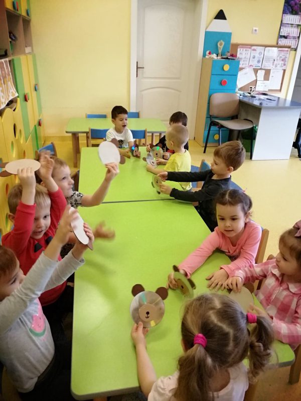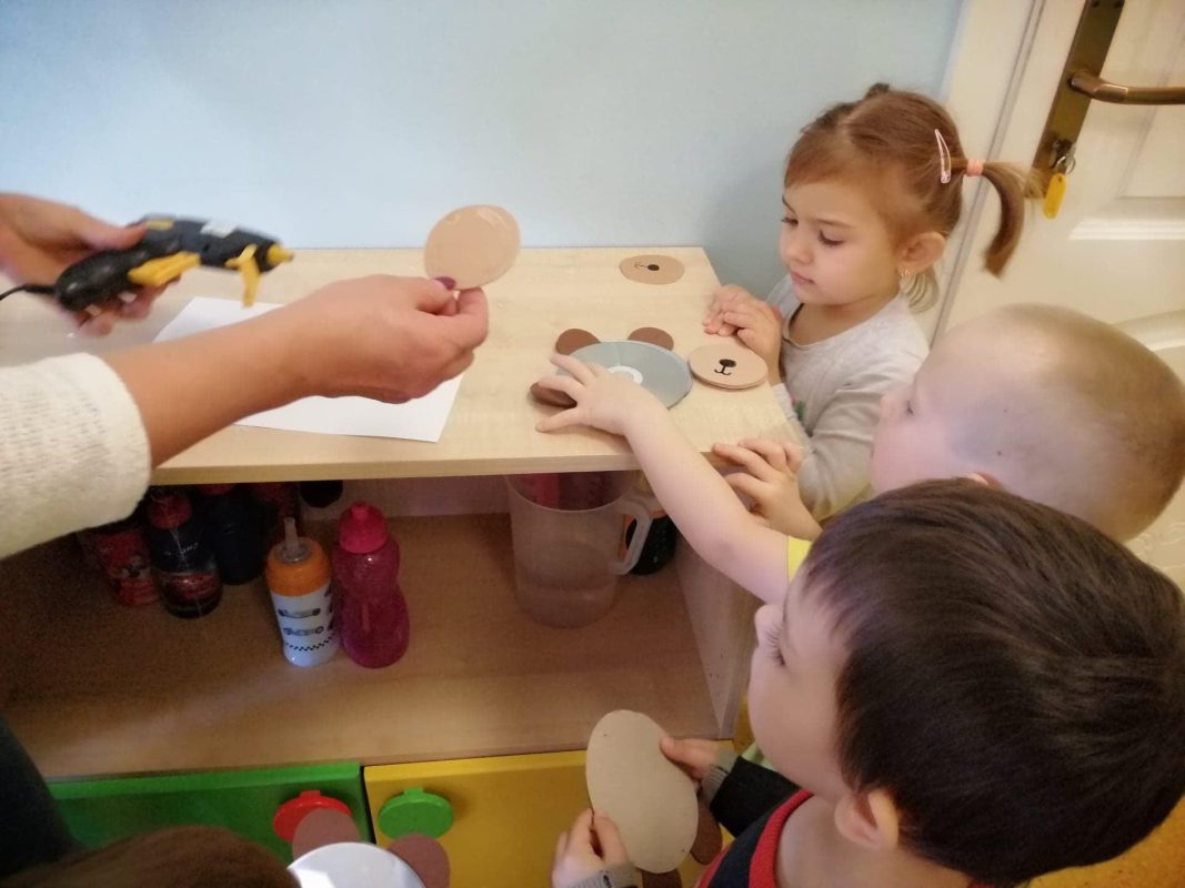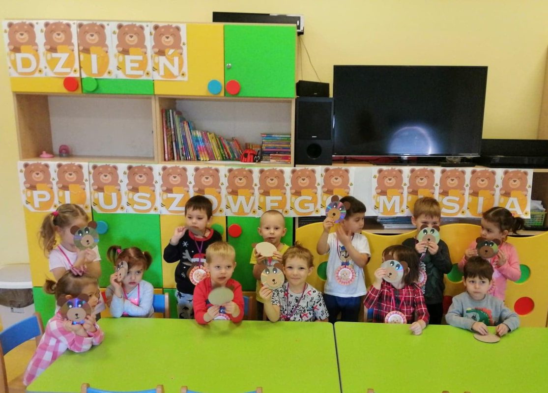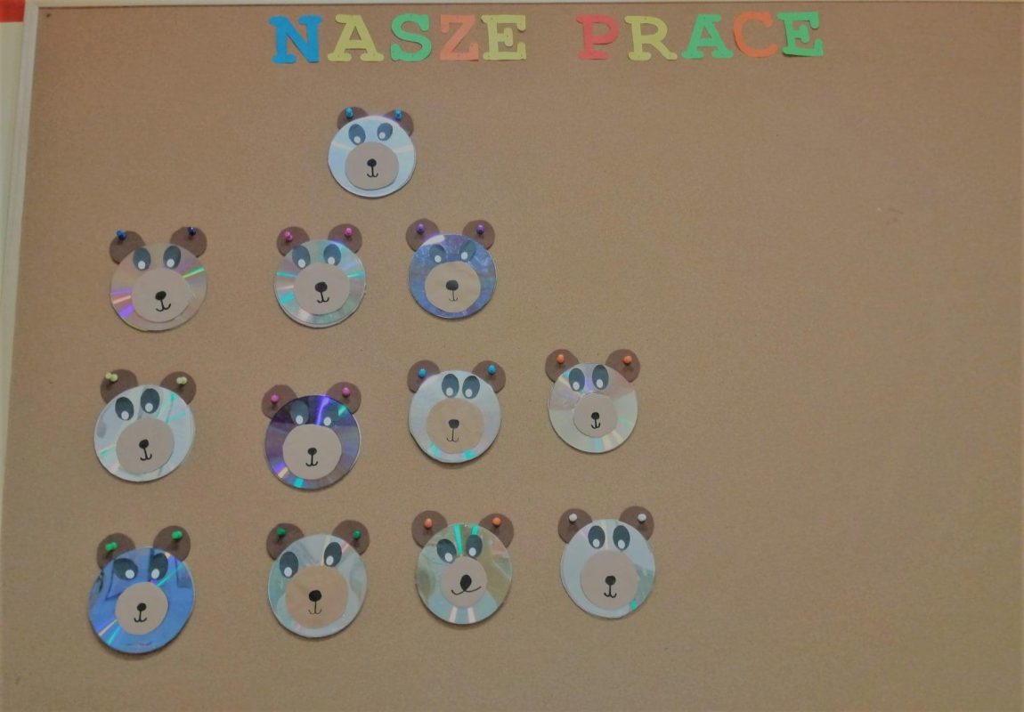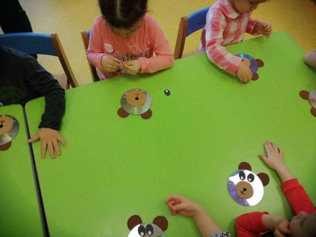 Niestety w tym roku klubowicze nie mogli przynieść swoich ulubionych pluszaków, dlatego wspólnie z ciociami udało nam się im zrobić chociaż buzie misia. Wykorzystane do tego zostały zużyte płyty CD. Dzieci bardzo chętnie współpracowały za co na zakończenie otrzymały medale „Przyjaciela Pluszowego Misia”.