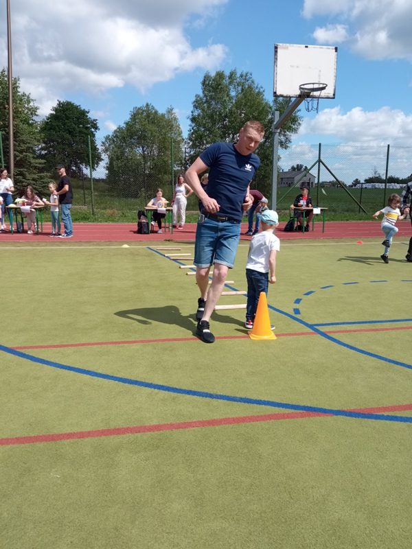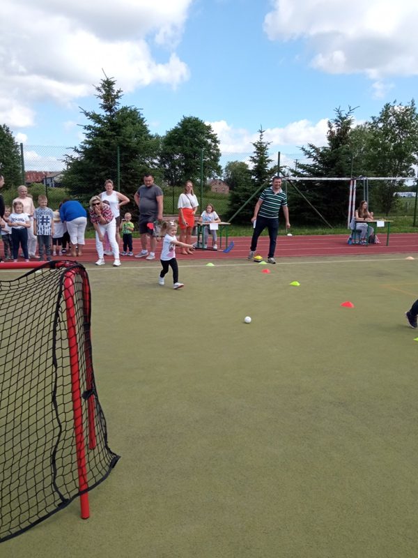 Po występach odbyło się wręczanie własnoręcznie zrobionych przez dzieci upominków. Było coś dla ducha, ale też i dla ciała, dlatego dalsza część uroczystości miała charakter sportowy. Dzięki ćwiczeniom przy muzyce zarówno dzieci jak i rodzice przygotowali swoje ciało do różnych zabawach sportowych, które jeszcze na nich czekały. Gwar, śmiech i radość słychać było na terenie całej szkoły. Wszyscy doskonale się bawili przy „skokach na jednej nodze” czy podczas zabawy w „strzelanie goli”. Przedszkolaki i pełni werwy rodzice, wspólnie spędzali czas na zabawie. Oprócz tych sportowych atrakcji Rodzice mogli podziwiać galerię swoich portretów wykonanych przez ich dzieci. Mamy nadzieję, że ten dzień, na długo pozostanie w pamięci Państwa jak i naszych małych przedszkolaków, bo wspólny czas – to najlepszy prezent i dla dziecka, i dla rodzica.