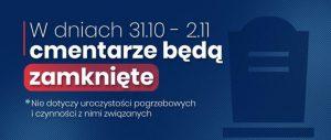 Reagujemy na szybko zmieniającą się sytuację epidemiologiczną. Za wszelką cenę chcemy odsunąć wizję całkowitego zamknięcia gospodarki. Podejmujemy kolejne kroki w celu zmniejszenia przyrostu zachorowań. W walce z koronawirusem musimy ograniczyć mobilność społeczną i przestrzegać zasad bezpieczeństwa. Dlatego też podjęliśmy decyzję o zamknięciu cmentarzy w dniach 31 października oraz 1 i 2 listopada. Nie dotyczy to jednak pogrzebów – uroczystości pogrzebowe będą mogły się odbywać w tym czasie. Seniorów prosimy, aby w tym trudnym czasie pozostali w domu.