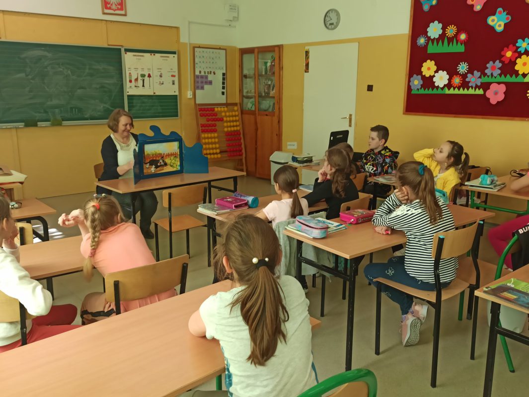 Głośne czytanie z teatrzykiem kamishibai gościło w Szkole Podstawowej w Bogatem z teatrzykiem kamishibai. Przedszkolaki i uczniowie klasy II wysłuchali bajki pt. „Kotka Psotka”, a klasie I zaprezentowano „Panią Zamieć”.