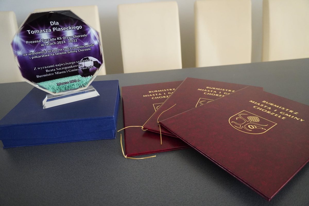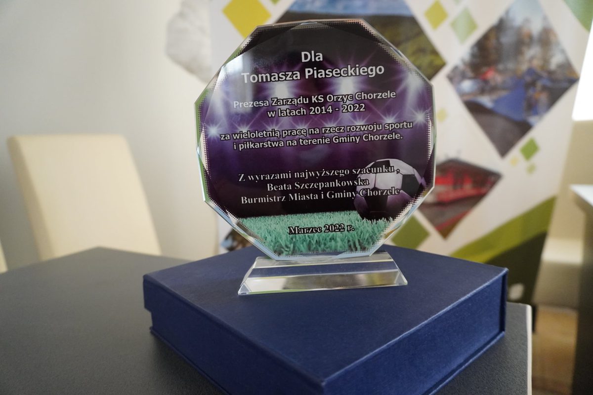 Burmistrz, podczas spotkania podziękowała oraz wręczyła specjalną statuetkę za wieloletnią pracę na rzecz rozwoju sportu i piłkarstwa na naszym terenie Panu Tomaszowi Piaseckiemu – Prezesowi KS Orzyc w Chorzelach w latach 2014 – 2022.