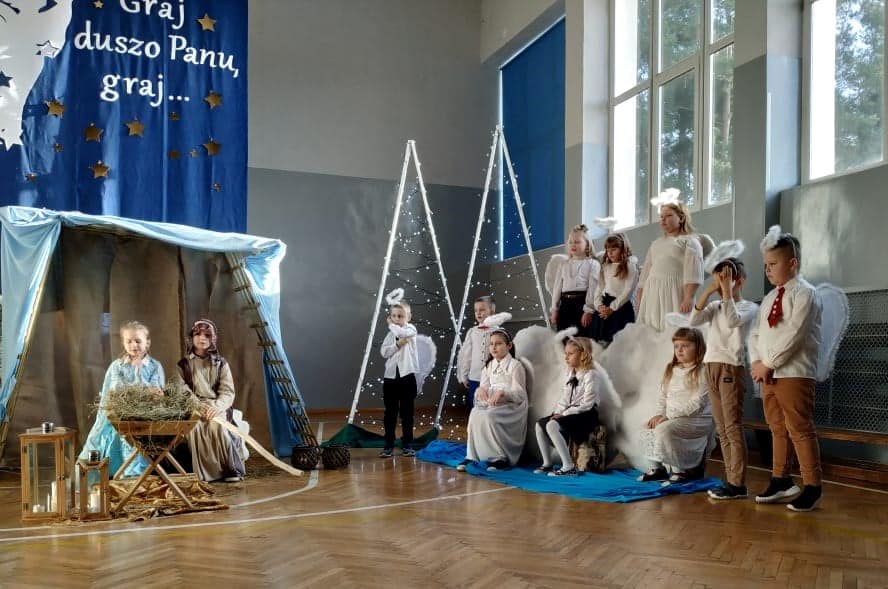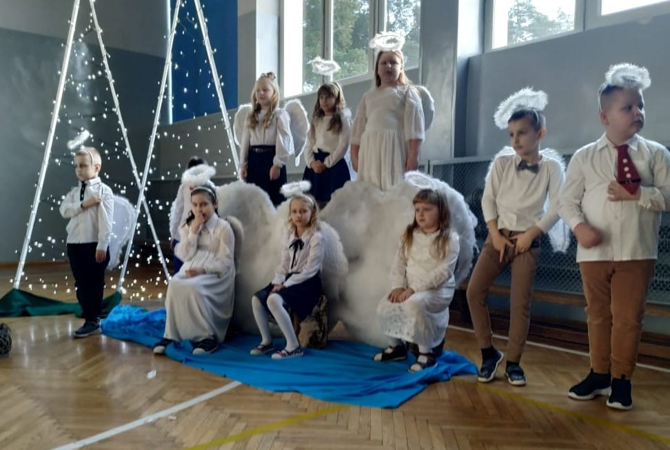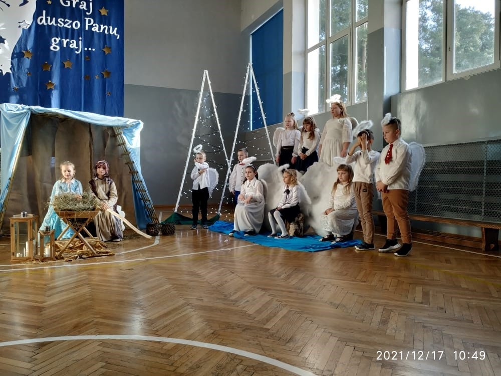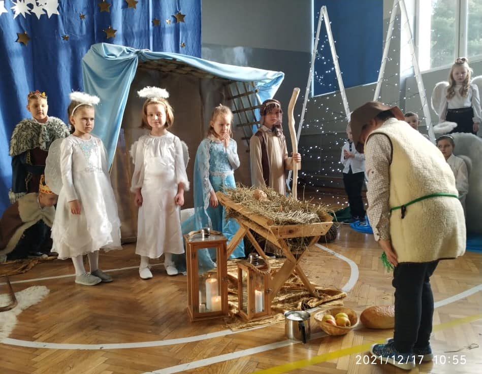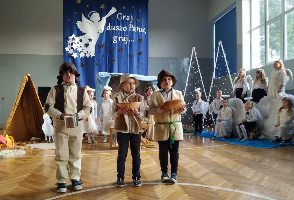 Ich aktorski występ wzbogaciły skoczne i rytmiczne pastorałki zaśpiewane z pomocą starszych kolegów z klasy piątej. Nad całością uroczystości czuwała katechetka pani Milena Dzieleńska.