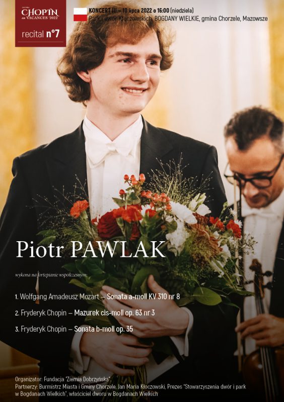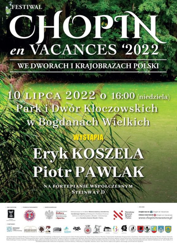 Dziś, możemy już ogłosić oficjalnie, że dzięki kilkutygodniowym staraniom Jana Marii Kłoczowskiego, prezesa Stowarzyszenia Dwór i Park w Bogdanach Wielkich oraz Beaty Szczepankowskiej, burmistrz Miasta i Gminy Chorzele – znaleźliśmy się ponownie wśród polskich lokalizacji, w których odbywać się będzie w tym roku Festiwal Chopin en Vacances 2022 we dworach i krajobrazach Polski.