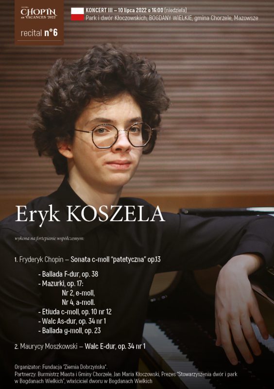 Burmistrz Beata Szczepankowska i Prezes Jan Maria Kłoczowski serdecznie zapraszają do Bogdan Wielkich, gdzie 10 lipca o godzinie 16.00, na terenie zabytkowego Dworu i Parku odbędzie się wspaniały, plenerowy koncert fortepianowy utworów Fryderyka Chopina.
