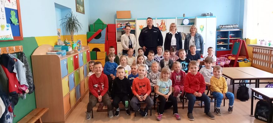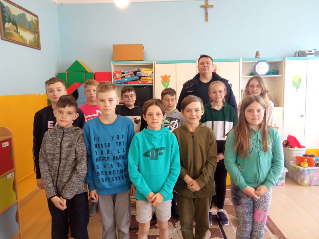 Pan dzielnicowy przypomniał uczniom o bezpiecznym poruszaniu się po drogach, kontakcie z osobami nieznajomymi, numerach alarmowych i sposobach powiadamiania służb ratunkowych.