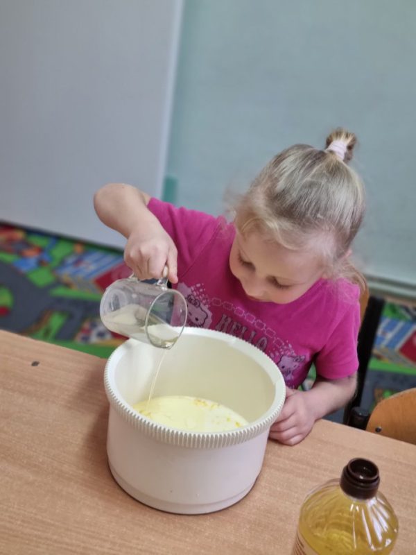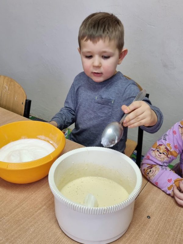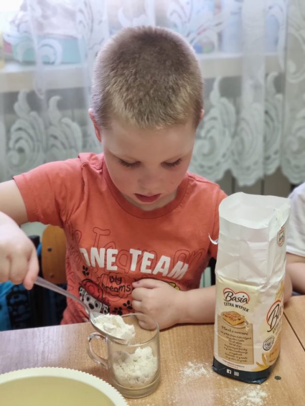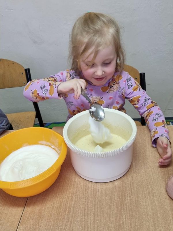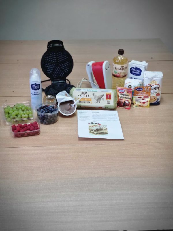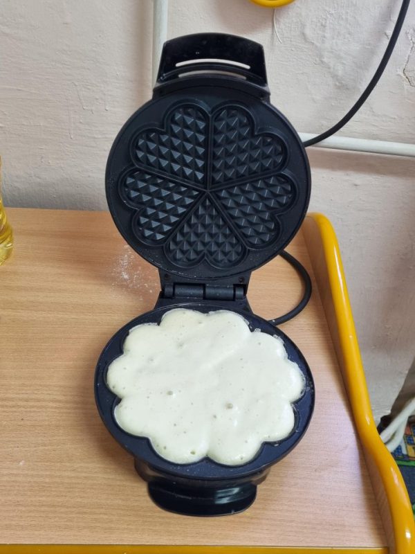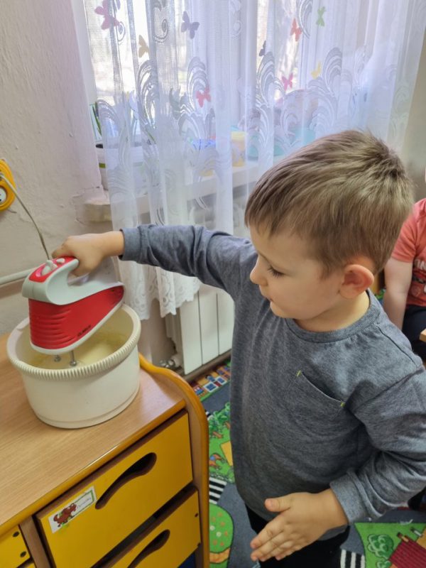 Poznały zasady bezpiecznego korzystania ze sprzętu kuchennego, doskonaliły umiejętność posługiwania się sztućcami. Utrwaliły przestrzeganie zasad higieny podczas posiłków oraz nawyków kulturalnego zachowania się przy stole. Przedszkolaki zapoznały się z urządzeniem elektrycznym jakim jest mikser kuchenny i z przepisem na pyszne gofry. Odmierzały składniki i wsypywały je do miski robota. Kiedy wszystko było gotowe, przystąpiły do pieczenia, a następnie do dekorowania.