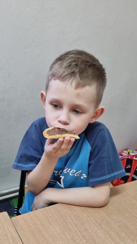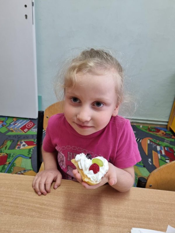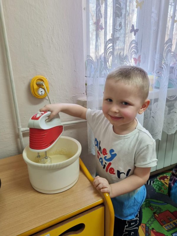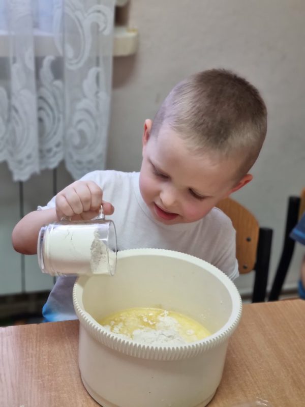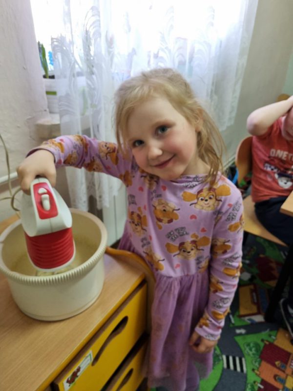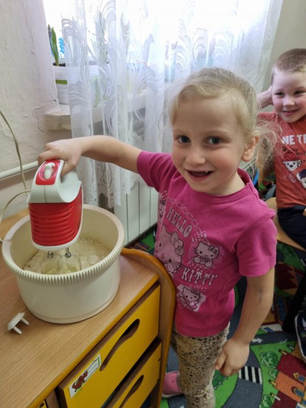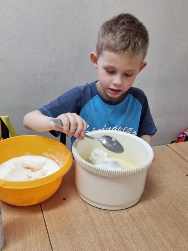 Poznały zasady bezpiecznego korzystania ze sprzętu kuchennego, doskonaliły umiejętność posługiwania się sztućcami. Utrwaliły przestrzeganie zasad higieny podczas posiłków oraz nawyków kulturalnego zachowania się przy stole. Przedszkolaki zapoznały się z urządzeniem elektrycznym jakim jest mikser kuchenny i z przepisem na pyszne gofry. Odmierzały składniki i wsypywały je do miski robota. Kiedy wszystko było gotowe, przystąpiły do pieczenia, a następnie do dekorowania.