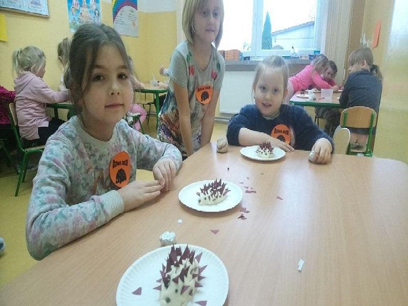 Przedszkolaki miały okazję poszerzyć wiadomości dotyczące środowiska naturalnego jeży, ich wyglądu, sposobu poruszania się, odżywiania oraz tego, w jaki sposób przygotowują się do zimy. Dzieci dowiedziały się również na jak długo jeże zapadają w sen zimowy. Potem uczestniczyły w zabawach ruchowych i tańczyły przy piosenkach o jeżach. Dużo radości sprawiła dzieciom zabawa „Na dywanie siedzi jeż…”, w której wszyscy naśladowali ruchy swoich kolegów. Dzieci wykonały także jeżykowe prace plastyczne, które ozdobiły sale przedszkolne.