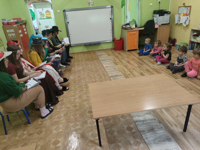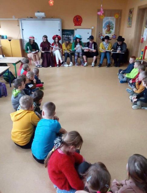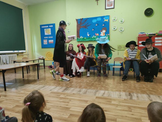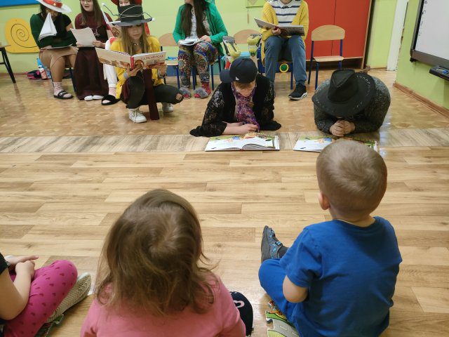 W tym roku imprezom czytelniczym towarzyszyło hasło – Historie to skrzydła, które pomagają wznosić się każdego dnia. Z tej okazji do najmłodszych zawitali starsi koledzy z klasy VIIIA z interpretacją tekstu książki Doroty Gellner pt. Wścibscy. Dzieciom bardzo podobał się występ i z uwagą słuchały opowiadań. W trakcie zajęć z wychowawczyniami przedszkolaki dowiedziały się w jaki sposób powstaje książka, od pomysłu do momentu wydania, odwiedziły także bibliotekę szkolną. Mamy nadzieję, że udało się, choć w niewielkim stopniu, zaszczepić w dzieciach miłość do książek.