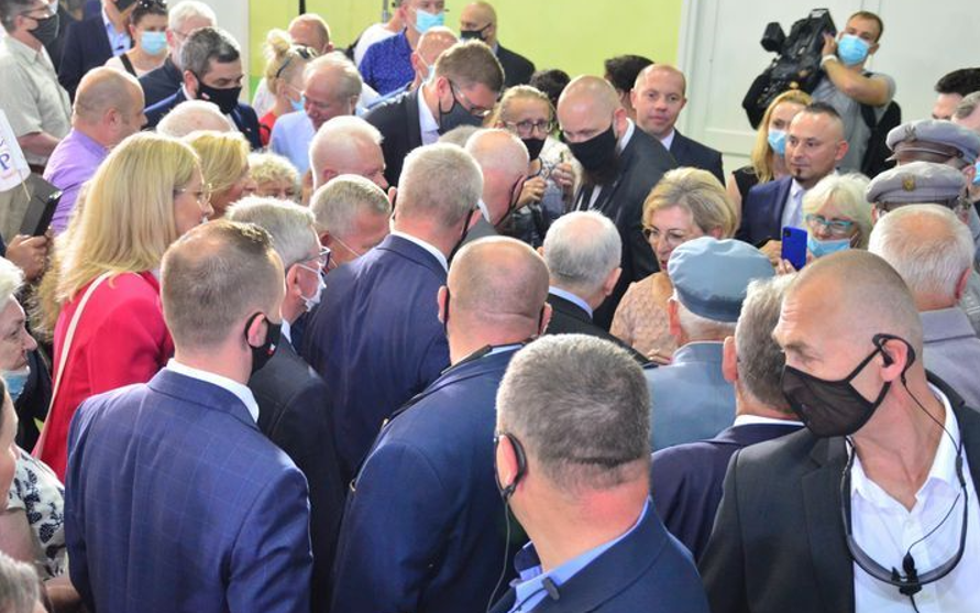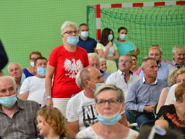 Nie wszystkim chętnym udało się wejść na spotkanie z wicepremierem Kaczyńskim, bo organizatorzy ograniczyli liczbę uczestników praktycznie do liczby krzeseł ustawionych na hali sportowej. Na zewnątrz pozostała też grupka przeciwników partii rządzącej z transparentem „PiS PO jedno zło”.