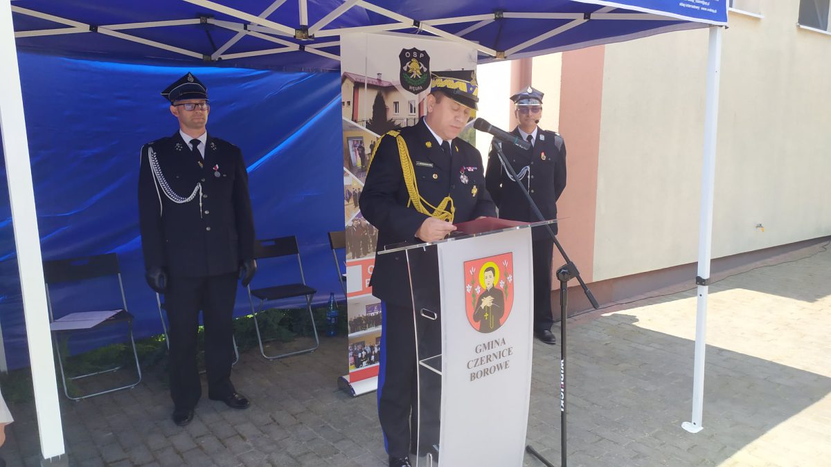 Po mszy św. poczet flagowy, poczty sztandarowe i strażacki pododdział złożony z członków wszystkich jednostek OSP z terenu gminy Czernice Borowe oraz OSP z Obręba na czele z Gminną Orkiestrą Dętą wraz z zaproszonymi gośćmi przemaszerowali na plac przy remizie. Po krótkiej zapowiedzi spikera uroczystości – dh. Piotra Marcińczyka – Dowódca Uroczystości dh Andrzej Glinka złożył meldunek Członkowi Prezydium Zarządu Oddziału Wojewódzkiego ZOSP RP Województwa Mazowieckiego dh. Bogdanowi Rzepczyńskiemu.