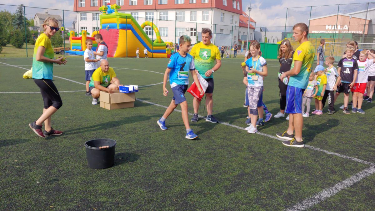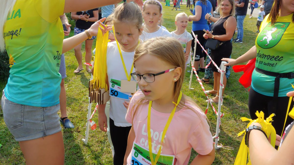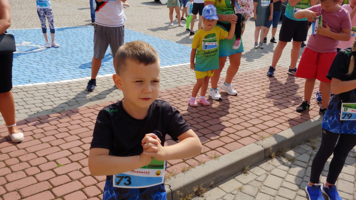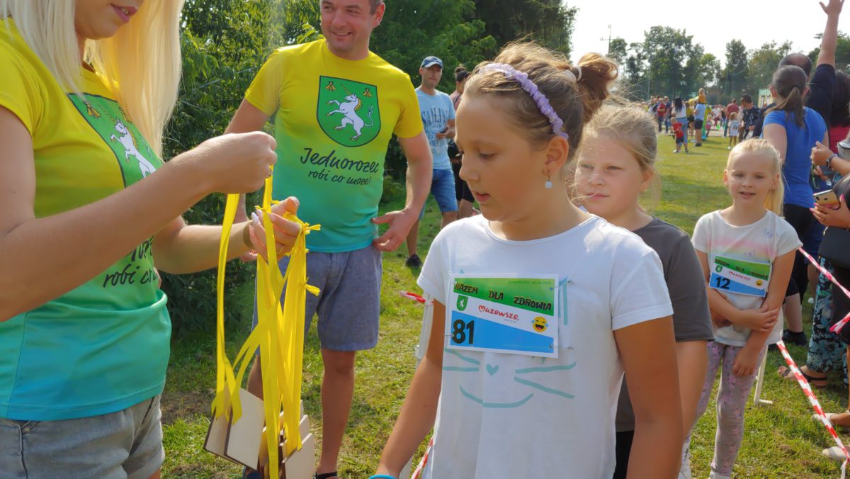 Już przed godziną 13 zaczęliśmy zapisy, bo dzieciaki nie mogły się doczekać. Natalia, Magda i Damian robili co mogli, by w biurze zawodów było szybko i sprawnie. W rozdawaniu pakietów pomagała im Kinga, Amelia i Karolina. No musicie przyznać, że idzie nam to coraz sprawniej! Praktyka czyni mistrza! A właśnie, tym razem rozgrzewkę poprowadziła Joanna Borczak w towarzystwie córki Oli i Magdy, która nigdy nie prowadziła żadnej rozgrzewki, a jak było widać jest do tego stworzona! Po rozgrzewce rozpoczęły się starty dzieci. Po biegu odbyły się konkurencje sportowe, którymi dowodzili Marcin i Robert. „Skoki w workach” oraz „rzuty do celu” zgromadziły niesamowitą liczbę chętnych. Najzręczniejsi zostali nagrodzeni, a wszyscy, którzy wzięli udział otrzymali słodkie drobiazgi. Po wysiłku wszyscy uczestnicy realizowali kupony na darmową watę i popcorn, które otrzymali w pakietach startowych. Tym razem pod namiotem stowarzyszenia rządzili nasi panowie: Michał, Waldek i Sylwek. Dziewczyny robiły co mogły, ale to panów kolejka błyskawicznie znikała. Brawo! Na zakończenie nasi wspaniale uzupełniający się spikerzy Darek i Marcin rozpoczęli losowanie nagród głównych: 2 rowerów, które w imieniu Wójta wręczyła Pani Liliana Zabielska – Sekretarz Urzędu Gminy Jednorożec. Jeden z rowerów pojechał do chłopca z Ciechanowa, a drugi do dziewczynki z Zambrowa,która stwierdziła :”Od dziś będę biegać!” I o to biega! Gratulacje! Rozlosowano jeszcze kilkanaście dość ciekawych nagród, zaś potem każdy otrzymał nagrodę pocieszenia, nie mogło przecież być smutnych minek na naszym biegu!