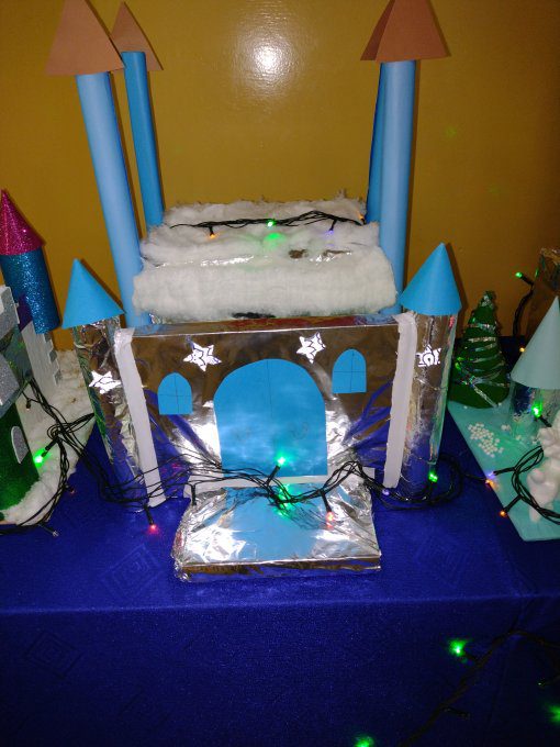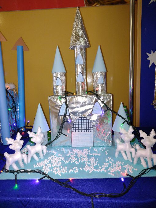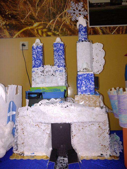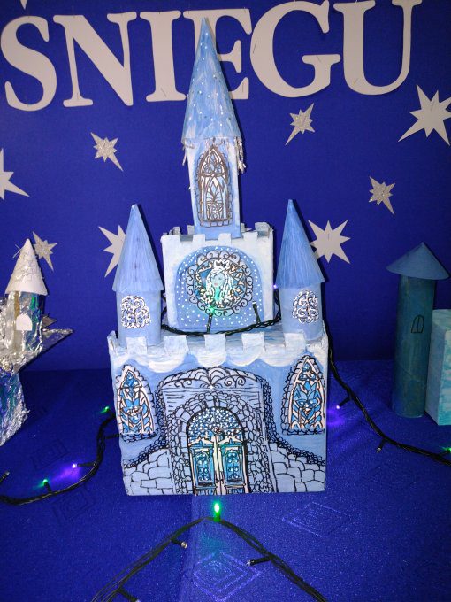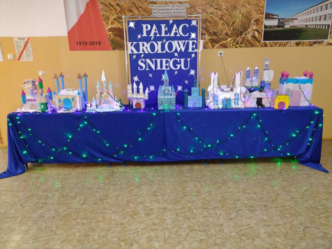 Dzięki wspaniałej współpracy między nimi, a wychowawcą udało się w pełni zrealizować zaplanowany program. Jednym z jego głównych punktów było zapoznanie dzieci z lekturą Hansa Christiana Andersena pt. „Królowa Śniegu”. Historia Kaya i Gerdy pokazała, jak wielka jest siła przyjaźni i miłości. Uczniowie mieli możliwość przyjrzeć się bliżej bohaterom baśni, przede wszystkim Królowej Śniegu. Ich zadaniem było zaprojektowanie, a następnie wykonanie jej pałacu. Technika oraz dobór materiałów były dowolne. Rozmiar, kształt, kolor również. Najważniejszymi narzędziami okazały się wyobraźnia oraz kreatywność, jakimi wykazali się nasi mali konstruktorzy. Dzięki pomocy rodziców, np. przy tworzeniu stabilnej struktury zamku, powstały niesamowite, bardzo ciekawe prace (wykonane w większości z kartonów, makulatury, czy rolek po papierze). Wychowawca po powrocie do szkoły postanowił podzielić się nimi z resztą szkolnej społeczności. W tym celu zorganizował wystawę na głównym korytarzu, która przeniosła wszystkich do wiecznej krainy śniegu.