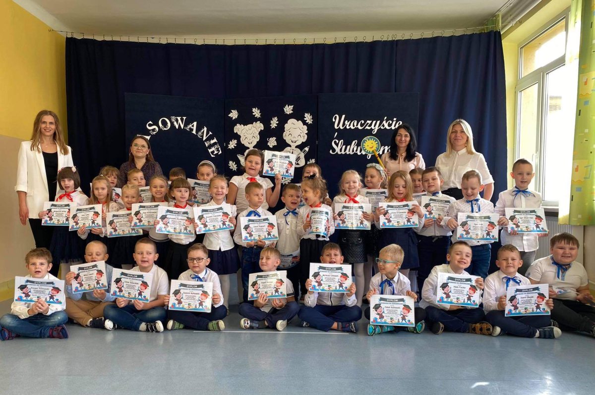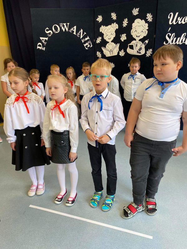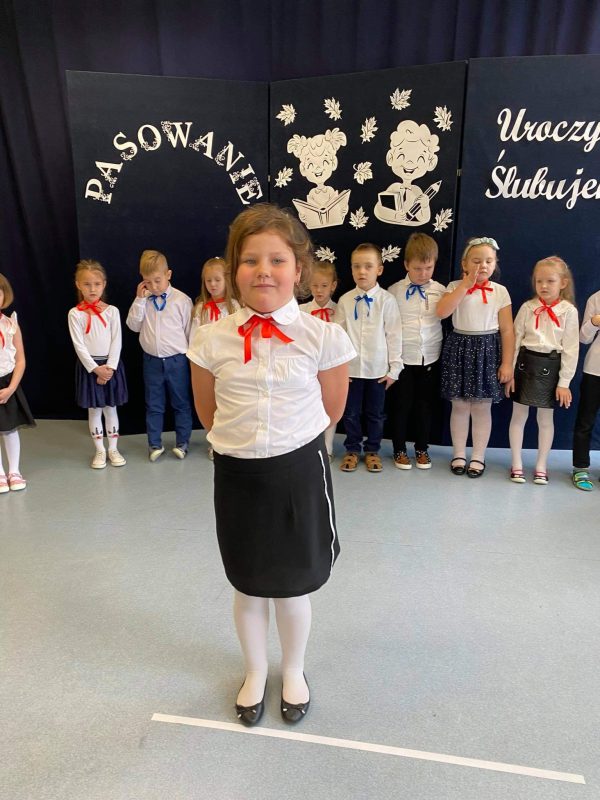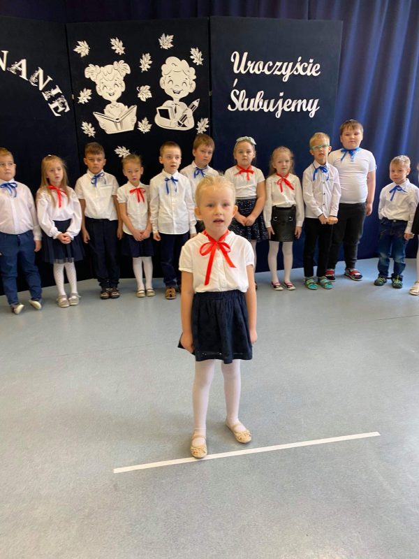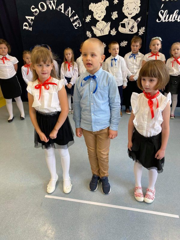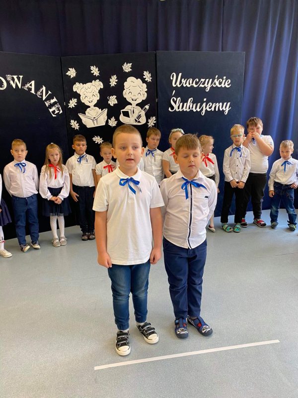 Zanim jednak doszło do tej ważnej chwili, przedszkolaki pochwaliły się recytowanymi wierszami oraz piosenkami. Chwilę potem dzieci złożyły uroczyste ślubowanie, że będą wzorowymi przedszkolakami, które nie tylko grzecznie się bawią i pilnie uczą, ale także dbają o kolegów i przyrodę. Następnie Pani Dyrektor dokonała uroczystego pasowania szkolnym słoneczkiem, a panie wychowawczynie wręczyły dzieciom dyplomy i upominki.
