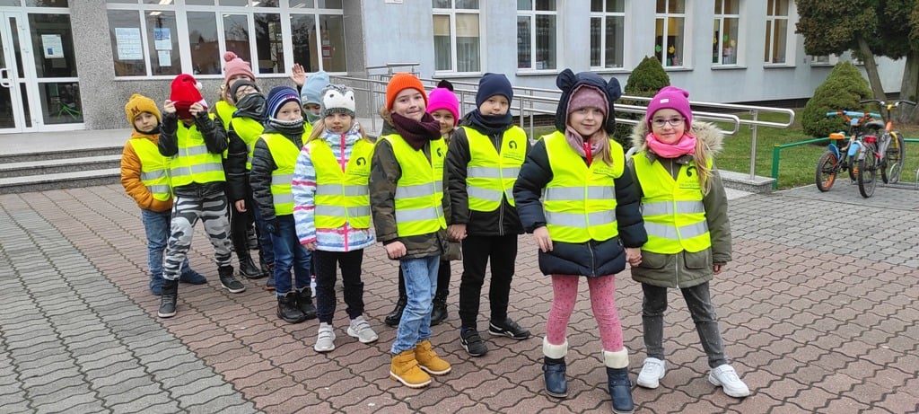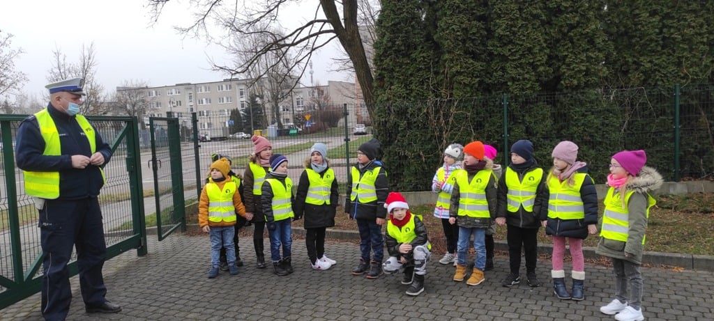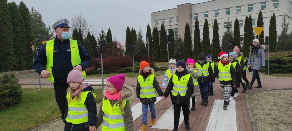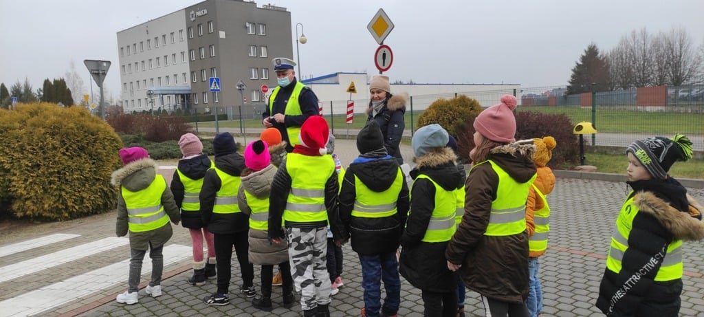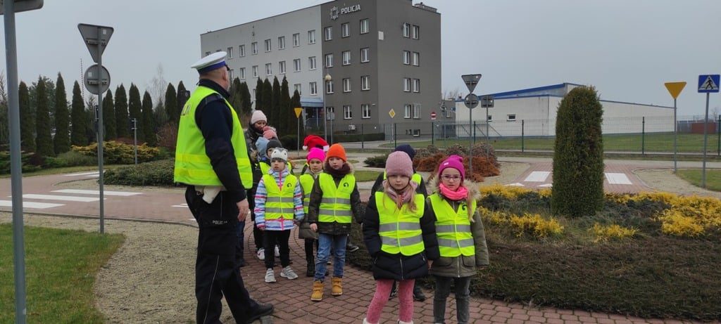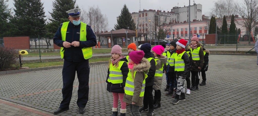 Szczególną uwagę zwrócił młodym słuchaczom na przepisy ruchu drogowego, zwłaszcza w odniesieniu do pieszych. Policjant przypominał uczestnikom spotkania o podstawowych zasadach bezpiecznego poruszania się po drogach na rowerze i hulajnodze, oraz wskazywał zagrożenia, na jakie mogą być narażone dzieci, jako uczestnicy ruchu drogowego. Na koniec dzieci miały okazję dokładnie obejrzeć radiowóz policyjny siadając za kierownicą auta, oraz urządzenia służące do pomiaru prędkości, oraz stanu trzeźwości. Ekscytację dzieci wywołało włączenie w radiowozie sygnałów świetlnych i dźwiękowych. Ucieszone, wdzięczne za spotkanie i bogatsze w wiedzę z zakresu bezpieczeństwa pierwszaki, wróciły do szkoły, planując już kolejne wizyty w miasteczku.