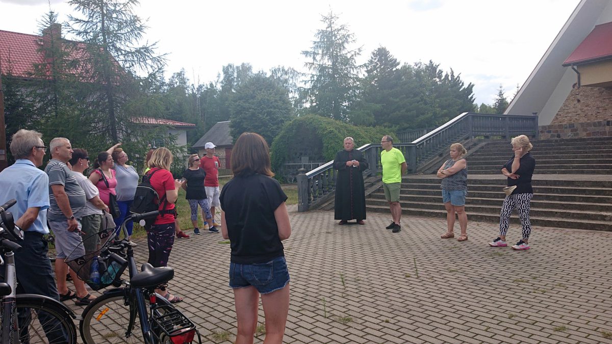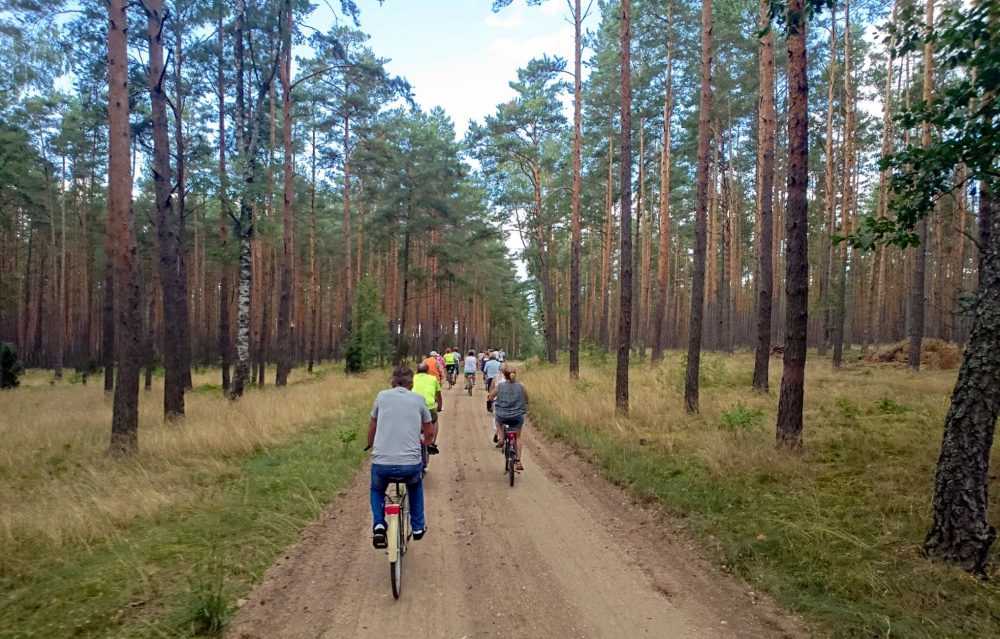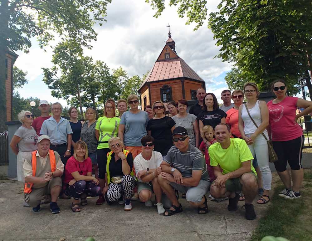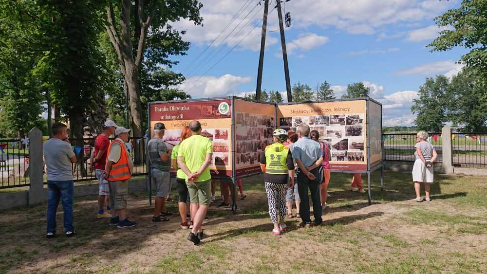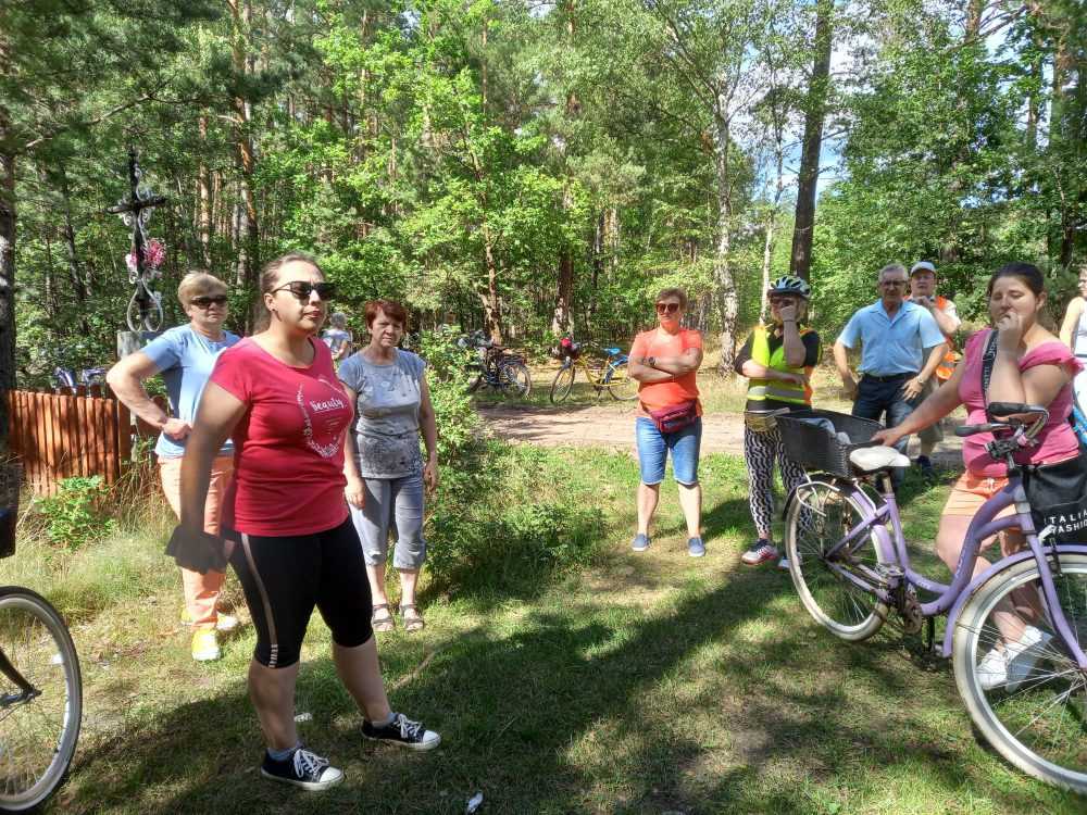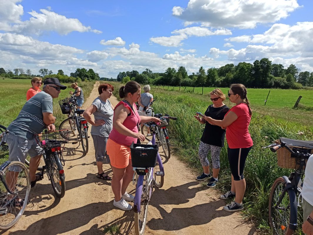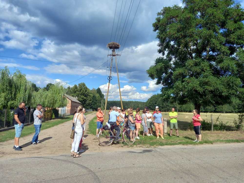 Było o regulacji Orzyca i do dziś widocznych pozostałościach tego procesu. Było o pochodzeniu nazw miejscowości i o przyrodniczych skarbach naszych nadorzyckich lasów. Nie zabrakło wspomnienia o rozwoju sieci parafialnej w dolinie Orzyca, stąd wizyta w kościele w Połoni. Była duma z niedawno otwartej wystawy plenerowej w Olszewce, którą odwiedziliśmy. Było głosowanie, którą drogą jechać – dzięki temu, mimo początkowych obaw o stan dróg po ostatnich deszczach, jechaliśmy pierwotnie zaplanowaną trasą. Była nieco bardziej wymagająca i dłuższa niż zwyczajowe nasze wyprawy, ale dla zaprawionych w rowerowych wojażach to nie problem! Okazało się, że dla tych, co byli z nami po raz pierwszy, też nie było problemu! Wreszcie było o nazwach miejscowych i przezwiskach na mieszkańców poszczególnych wsi. A to dlatego, że na finał pikniku przywitało nas Koło Gospodyń Wiejskich „Jasie” z Małowidza. Ja się nie spodziewałam, że tak nas ugoszczą! Potwierdzili znany już nam schemat – robisz coś z KGW, przygotuj się, że będzie na wypasie!