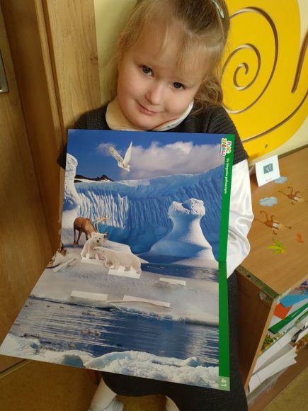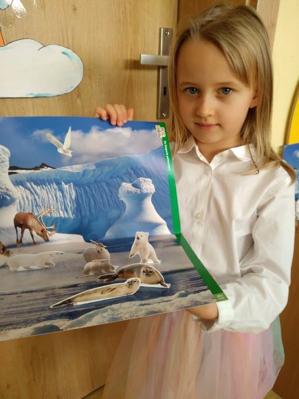 Na zajęciach była mowa o niedźwiedziach polarnych, fokach, pingwinach i morsach. Dzieci dowiedziały się również, że na biegunie mieszkają sowy, zające i wilki polarne. Aby przybliżyć najmłodszym temat zimna, lodu i śniegu, dzieci brały udział w zabawach sensorycznych Przedszkolakom bardzo spodobała się taka forma zajęć i w przyszłości na pewno do niej wrócimy.