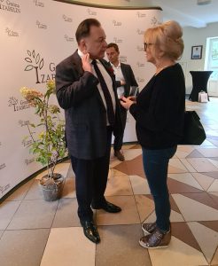 Burmistrz wręczyła panu marszałkowi ekologiczne upominki w postaci pięknych drzewek sygnowanych logiem „W Gminie Chorzele sercom bliska ochrona środowiska”.