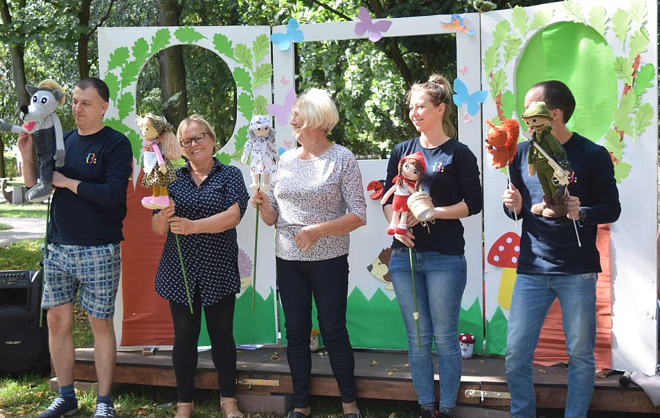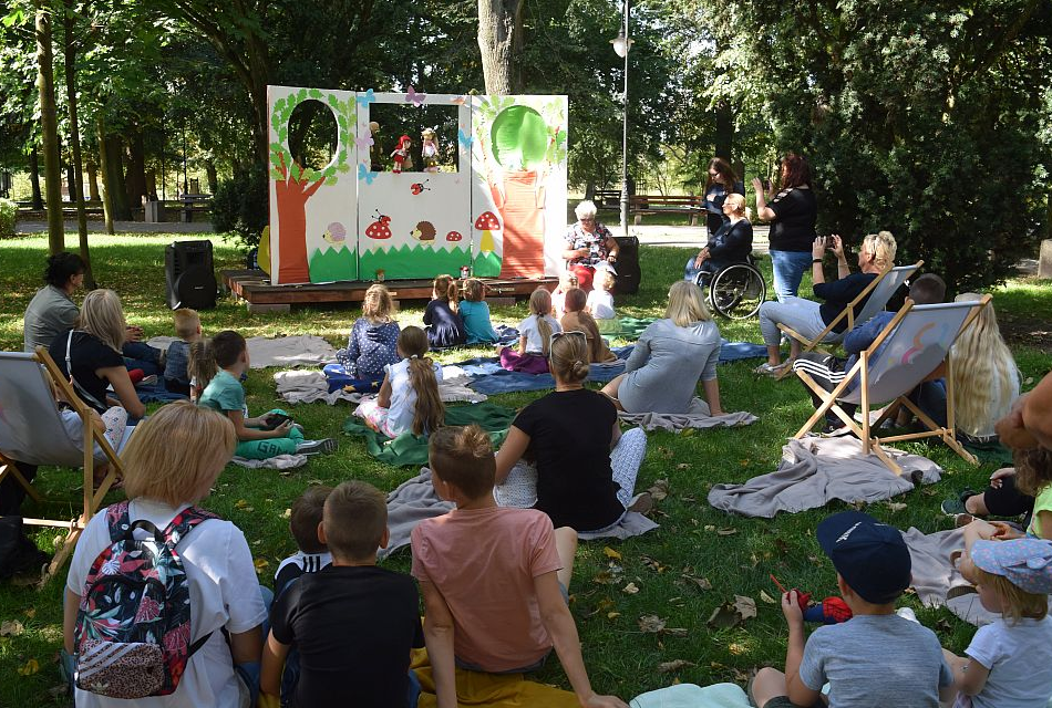 W sobotę, 11 września biblioteka zaprosiła swoich najmłodszych czytelników do parku miejskiego. Wśród naturalnej scenografii, zieleni drzew i przebijających przez nie promyków słońca maluchy mogły obejrzeć przedstawienie kukiełkowe „Czerwony kapturek” przygotowane przez pracowników biblioteki i panie z Klubu Rękodzieła