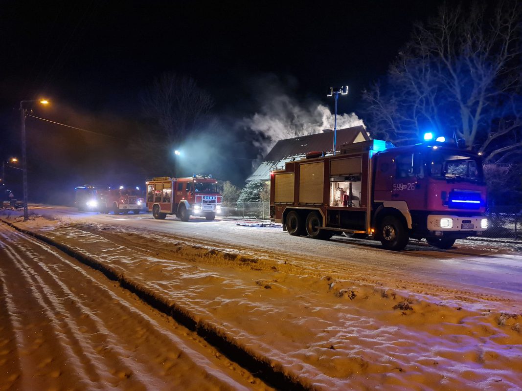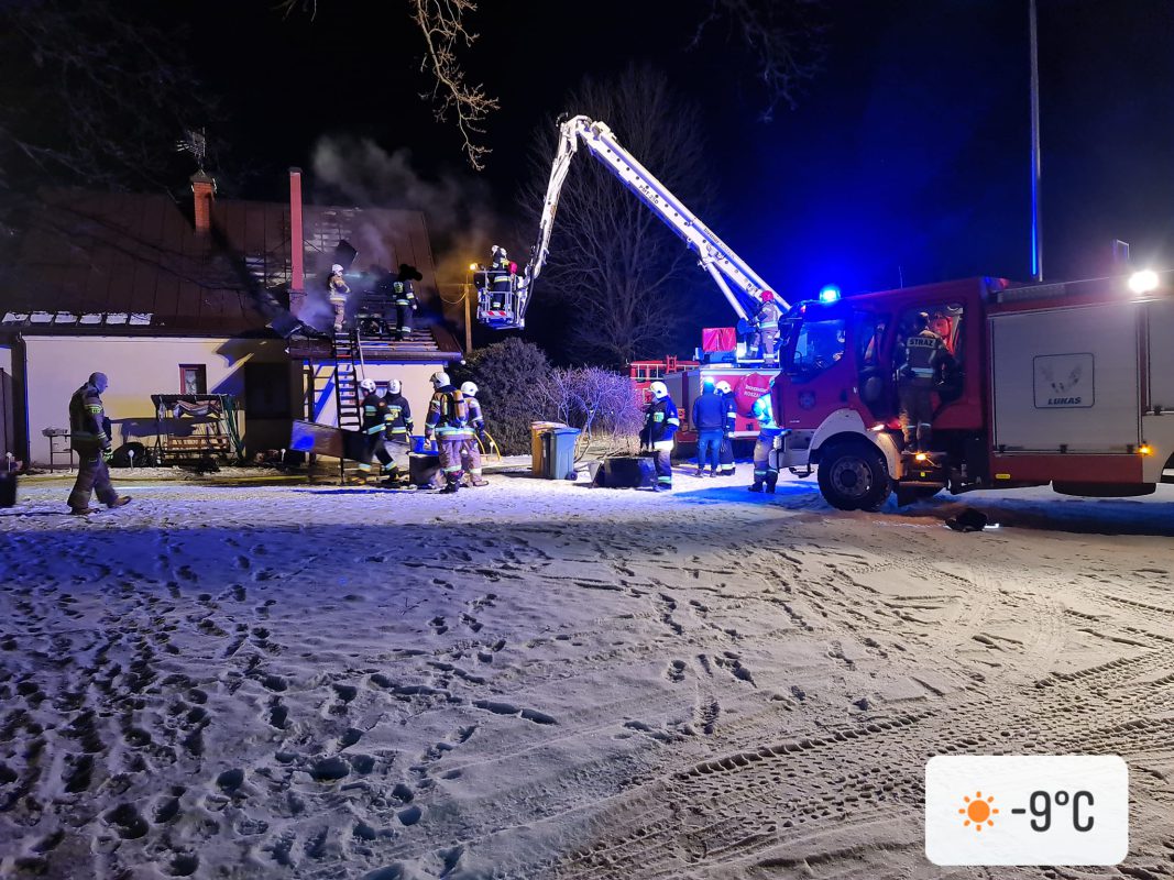 Wstępne informacje mówiły o pożarze sadzy w przewodzie kominowym oraz wydostającym się dymie z poddasza budynku mieszkalnego. Po dotarciu na miejsce pierwszych zastępów stwierdzono pożar poszycia dachowego wokół komina.