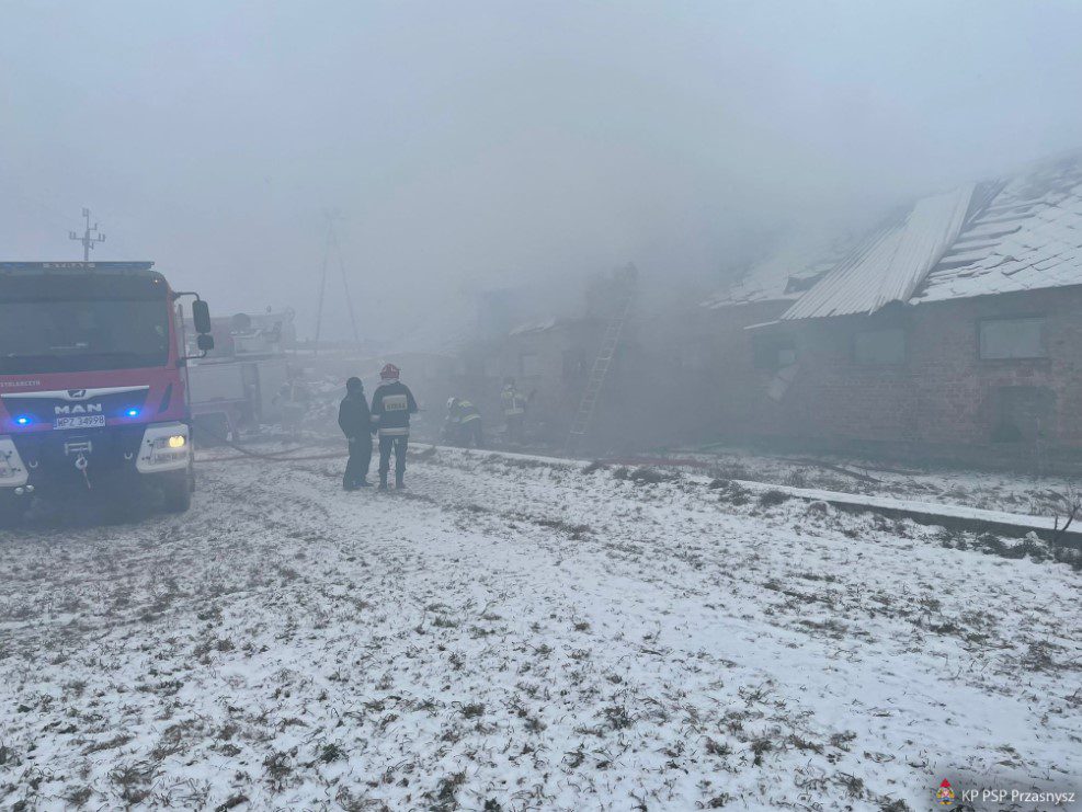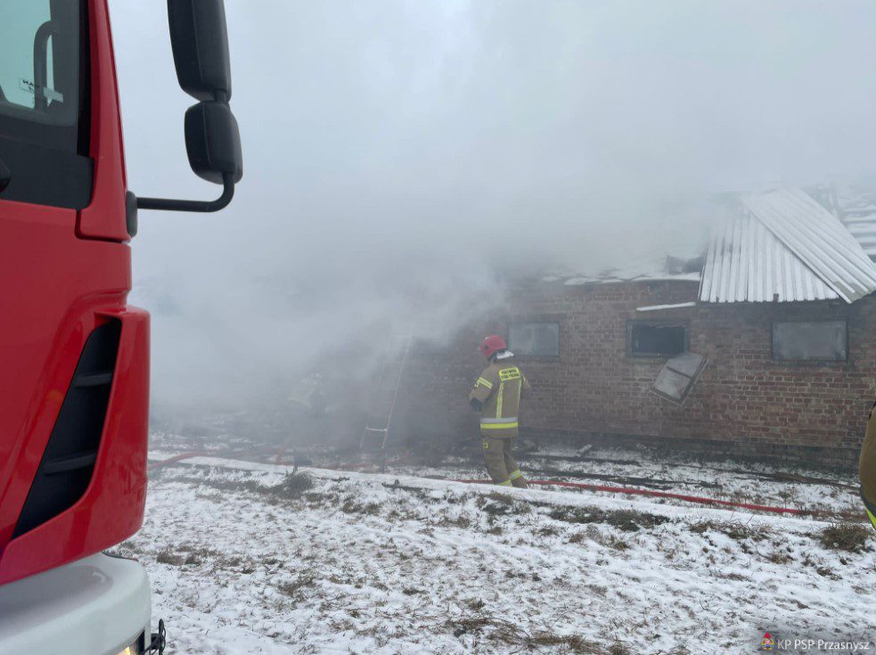 – Około godziny 11:20 do Stanowiska Kierowania Komendanta Powiatowego PSP w Przasnyszu wpłynęło zgłoszenie o pożarze obory w miejscowości Obrąb – mówi kpt. Piotr Kuligowski, oficer prasowy Komendanta Powiatowego PSP w Przasnyszu – Po przybyciu na miejsce pierwszych zastępów straży pożarnej stwierdzono, że pali się słoma oraz drewniany strop na poddaszu obory. Natychmiast przystąpiono do działań gaśniczych podając 3 prądy gaśnicze do wnętrza budynku.