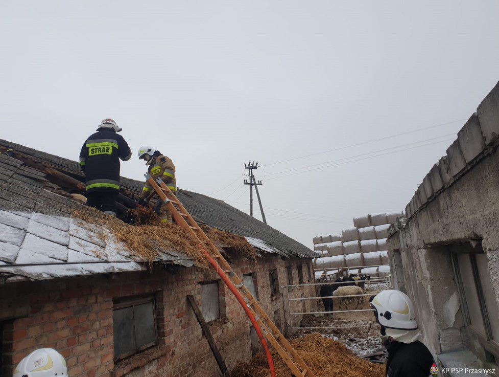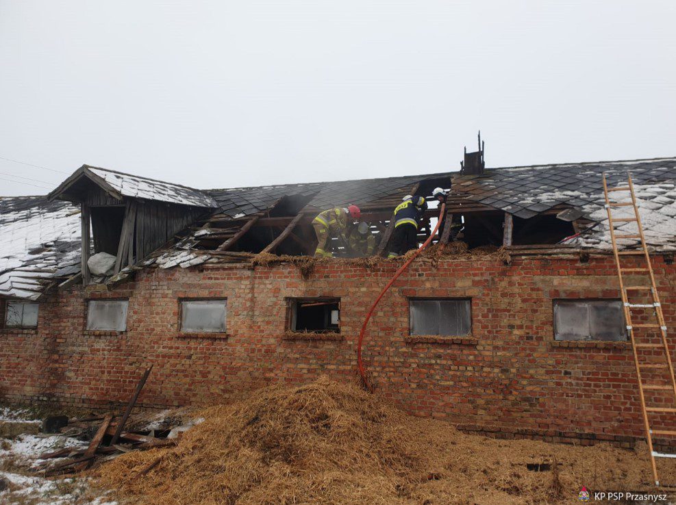 W międzyczasie ewakuowano 50 sztuk bydła. W celu dotarcia do źródła ognia przystąpiono do wykonania otworów w poszyciu dachu przy pomocy specjalistycznego sprzętu co umożliwiło lokalizację i ugaszenie pożaru.