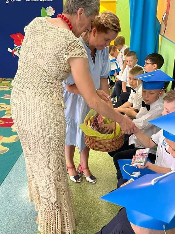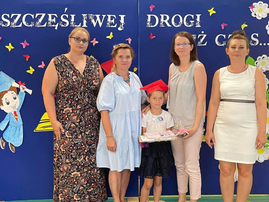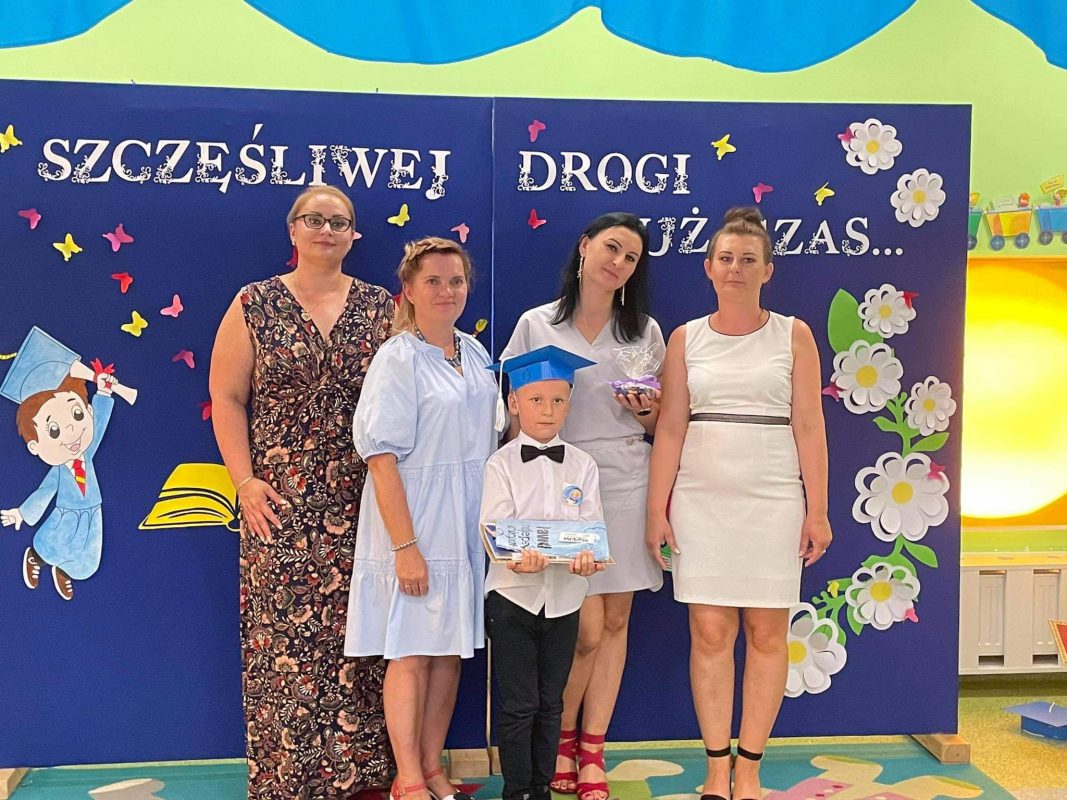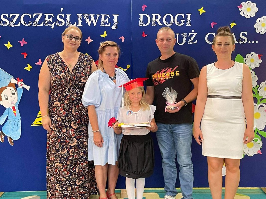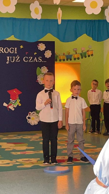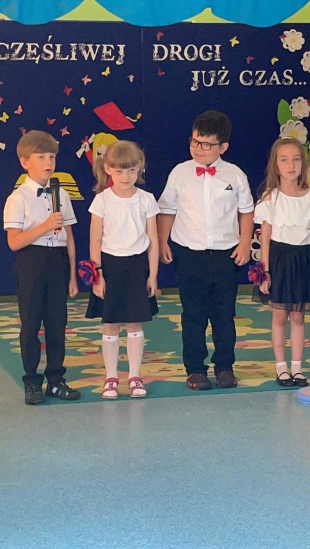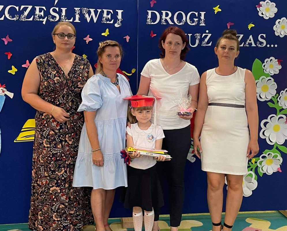 Następnie dzieci zaprezentowały krótką część artystyczną i w słowach wierszy i piosenek podziękowali wszystkim pracownikom przedszkola za trud włożony w ich rozwój oraz wychowanie. Po występie głos zabrała Dyrekcja przedszkola, która pogratulowała wszystkim starszakom udanego i pracowitego roku. Gorące podziękowania oraz dyplomy odebrali Rodzice, którzy w sposób szczególny angażowali się w pracę na rzecz naszego przedszkola. Także Rodzice w imieniu swoim i dzieci podziękowali pracownikom przedszkola za serce, trud i cierpliwość okazaną ich pociechom. Uroczystość zakończyła się rozdaniem dyplomów oraz upominków. Serdecznie gratulujemy przyszłym pierwszoklasistom. Życzymy im samych sukcesów w dalszej edukacji, wytrwałości w zdobywaniu kolejnych szkolnych szczytów i niegasnącej chęci zgłębiania wiedzy