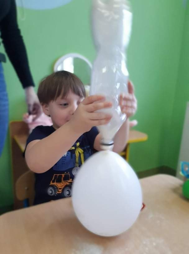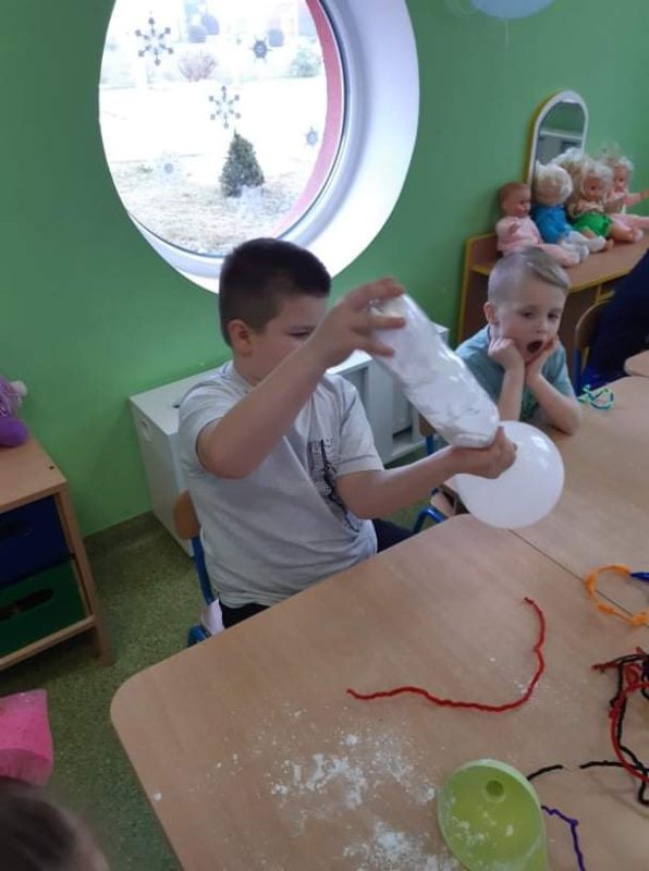 Uwielbiamy balony, ale dzisiaj postanowiliśmy wykorzystać je w inny sposób. W balon włożyliśmy lejek, przez który wsypaliśmy mąkę. Następnie zawiązaliśmy supełek i mieliśmy już gniotka. Teraz już tylko kosmetyka – oczy, buzia, włosy. Dzieci same zrobiła swoją „wymarzoną” zabawkę i są z niej bardzo dumne.