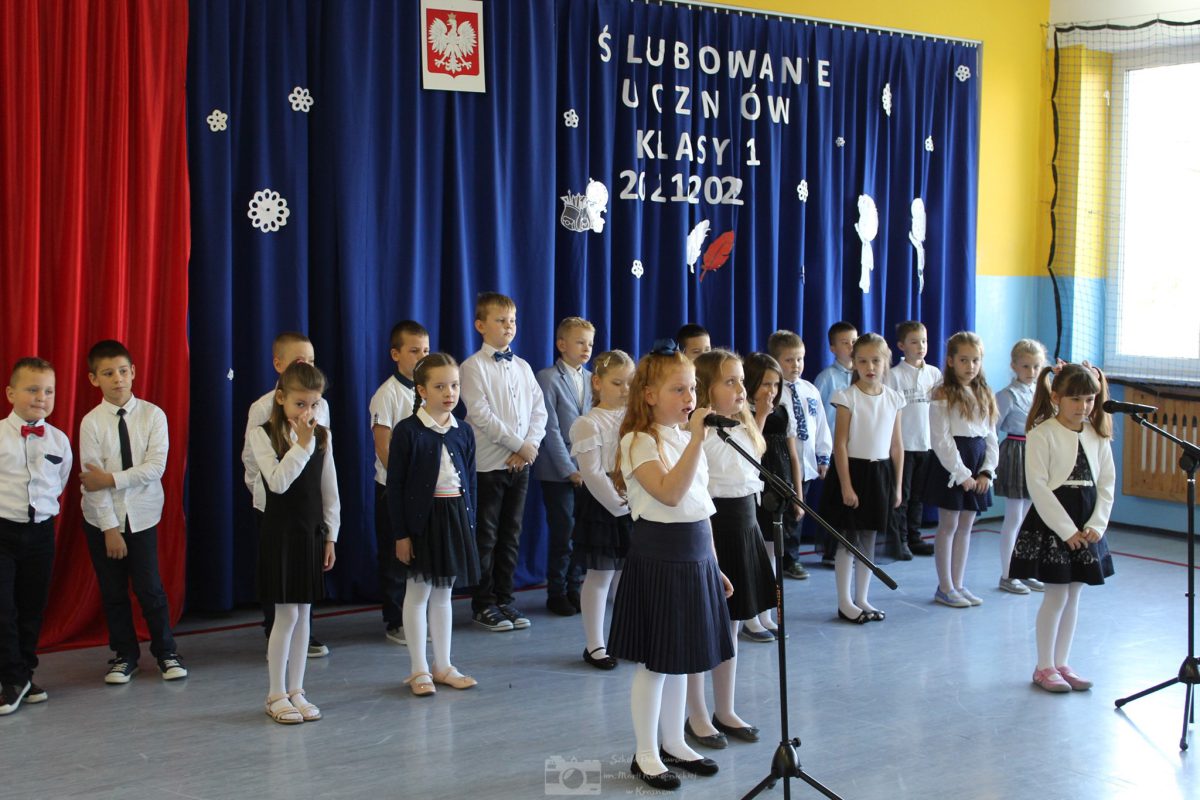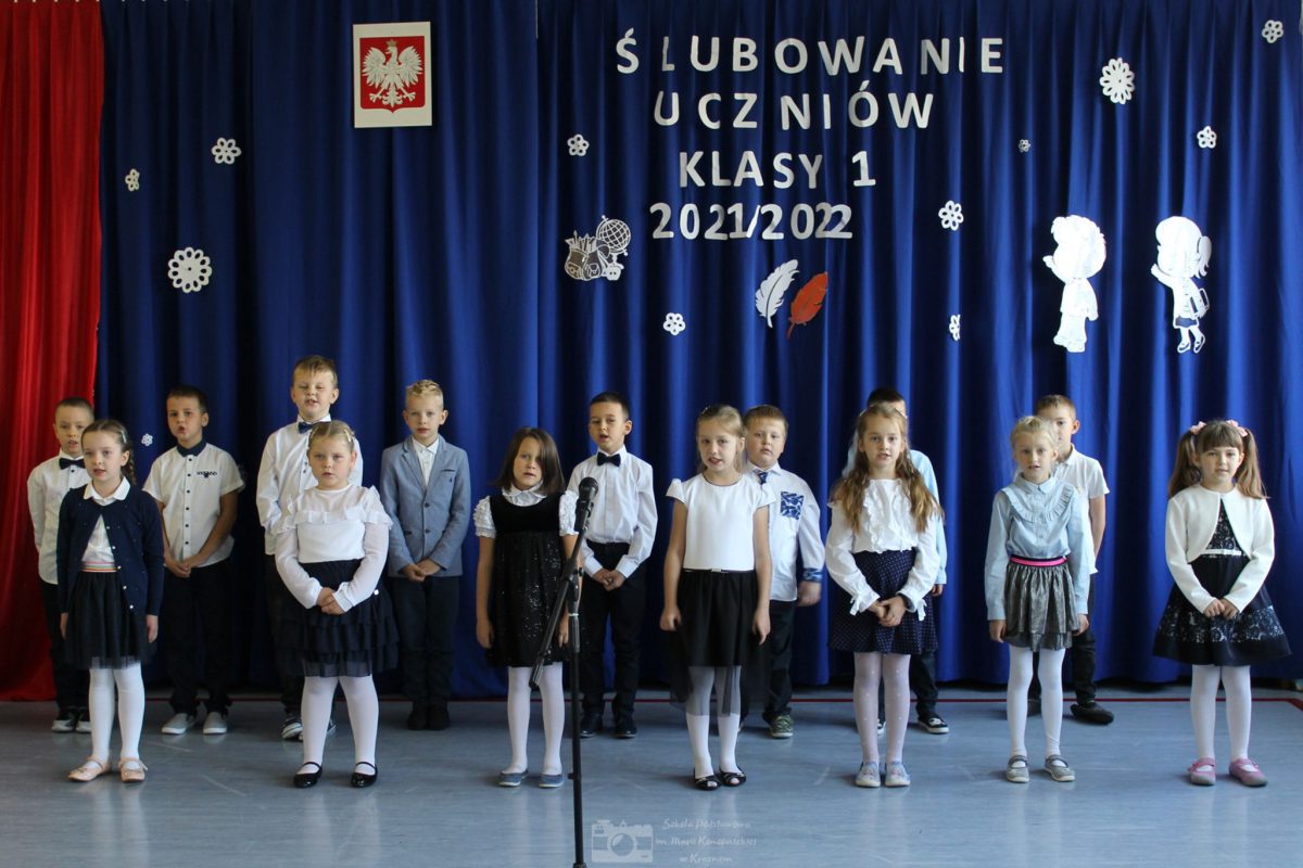 Bohaterowie dnia, pierwszoklasiści, z dużym zaangażowaniem emocjonalnym przedstawili przygotowany program artystyczny. W wierszach i piosenkach zaprezentowali swoje wiadomości pozwalające przystąpić im do ślubowania. Program zawierał utwory o tematyce patriotycznej, ale też wesołe dotyczące życia szkolnego. Potem dzieci złożyły uroczyste ślubowanie. Następnie pani dyrektor Małgorzata Balcerzak „szkolnym ołówkiem” pasowała każde dziecko na ucznia Szkoły Podstawowej im. Marii Konopnickiej w Krasnem. Gratulacje uczniom wraz z życzeniami: „Niech nauka będzie dla Ciebie radością” – złożyła też wychowawczyni pani Bożena Frączyk. Na pamiątkę tego wydarzenia uczniowie otrzymali dyplomy oraz prezenty przygotowane przez rodziców.
