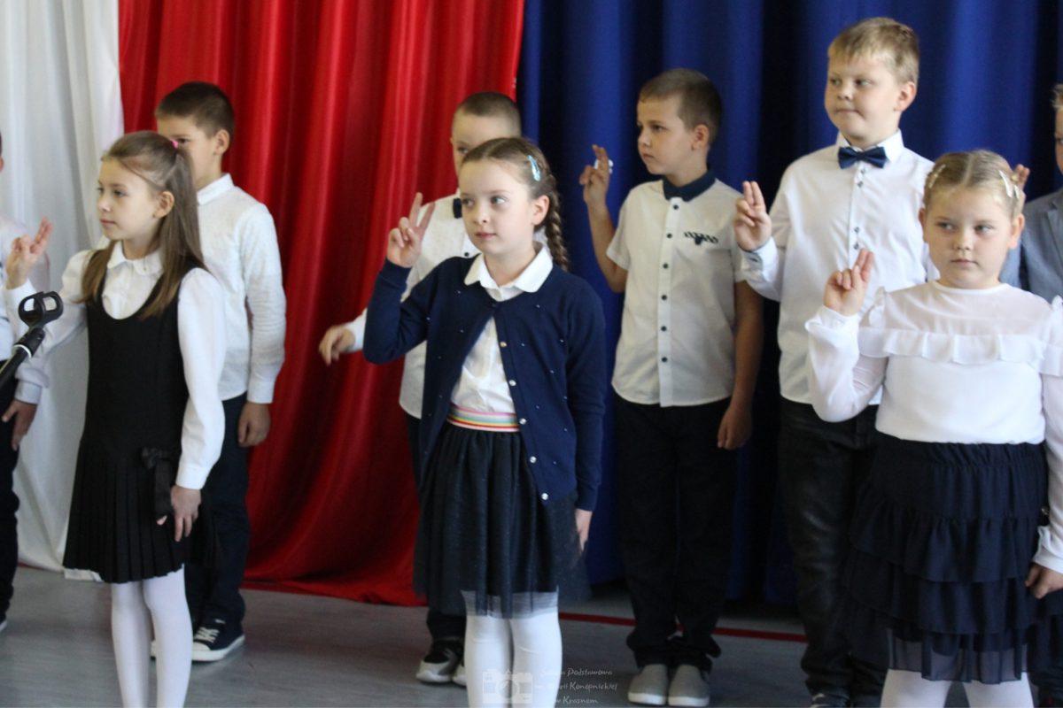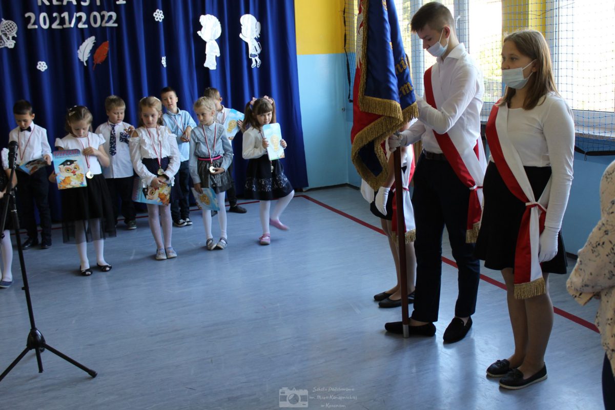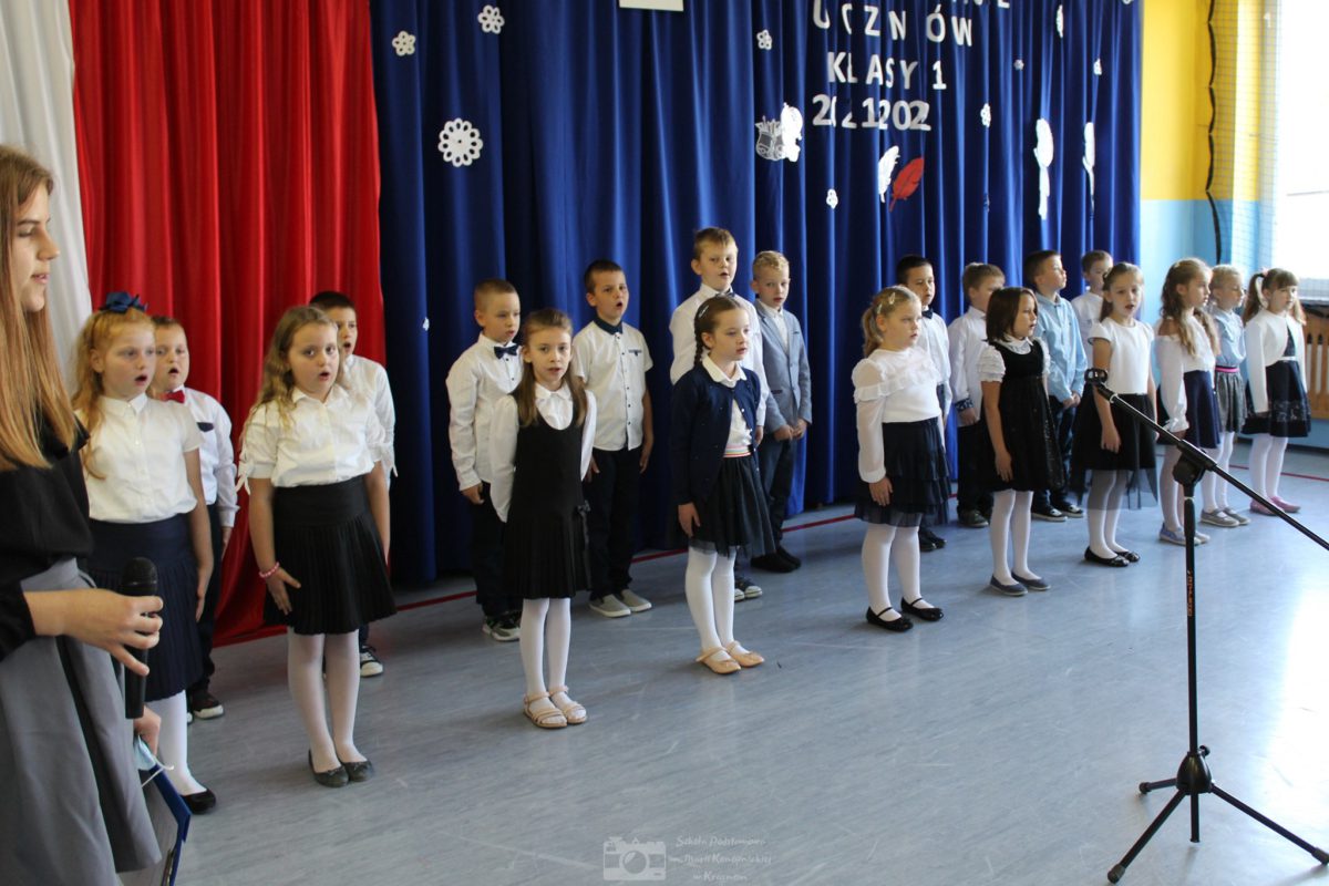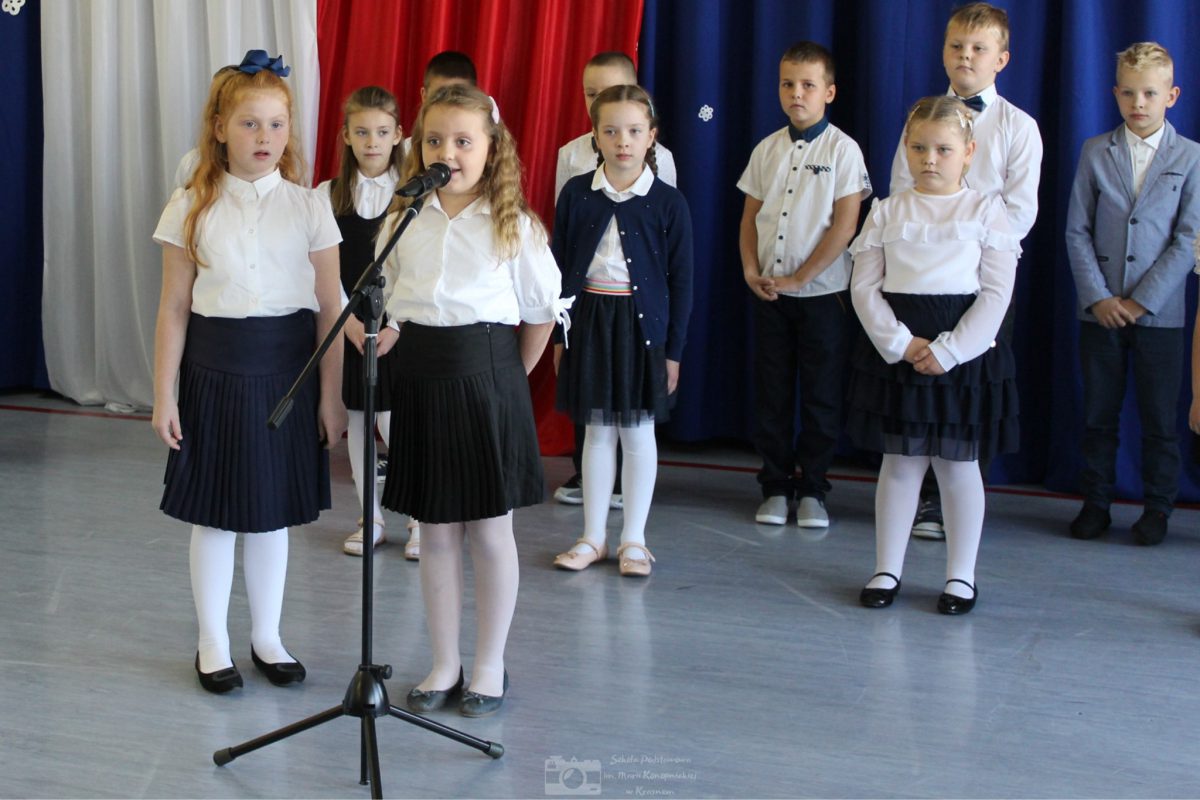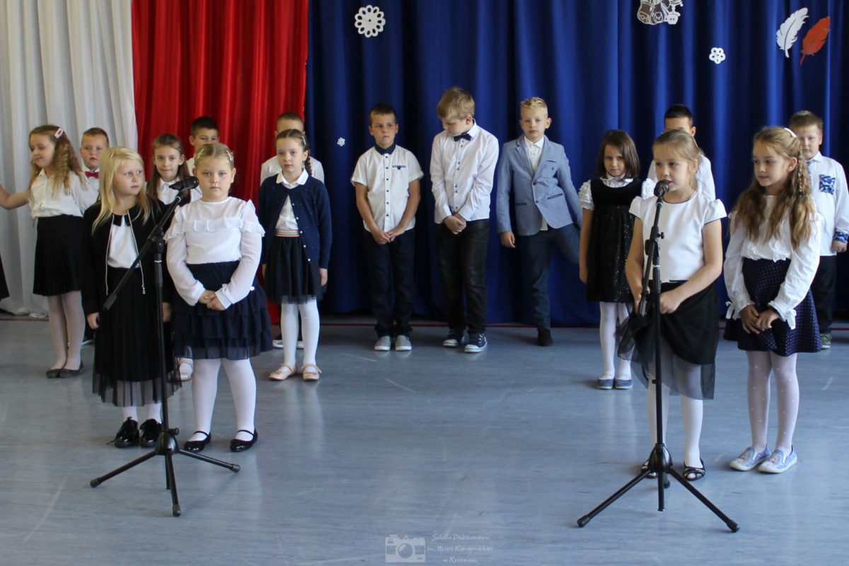 Powagi wydarzeniu dodawali zgromadzeni goście: rodzice oraz Pani Dyrektor szkoły, odświętny strój dzieci, dekoracja sali, ale przede wszystkim obecność pocztu sztandarowego i sztandaru Szkoły Podstawowej im. Marii Konopnickiej w Krasnem. Podniosły nastrój uroczystości wzmocniło wspólne odśpiewanie hymnu państwowego.