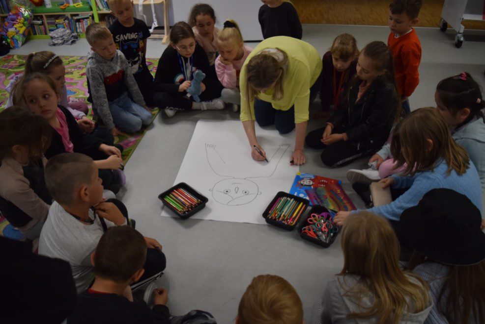 Pani Joanna warsztaty rozpoczęła od przeczytania książki. Głównym bohaterem książki jest przedszkolak, Krzyś. Chłopiec ma problem- w stresujących sytuacjach się czerwieni. Krzyś marzy o tym, aby zagrać w przedszkolnym teatrzyku. Nie chce jednak, aby Czerwony mu przeszkadzał. Chłopiec próbuje więc oswoić potwora. Czy zadanie to uda się chłopcu? Książka była wstępem do rozmowy z dziećmi o emocjach. Zadaniem uczestników było określenie reakcji na stres różnymi kolorami. Zwieńczeniem spotkania było namalowanie przez dzieci swoich lęków w postaci kolorowych potworów.