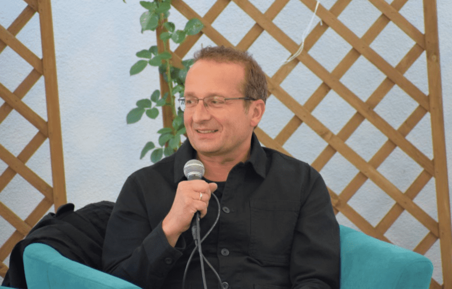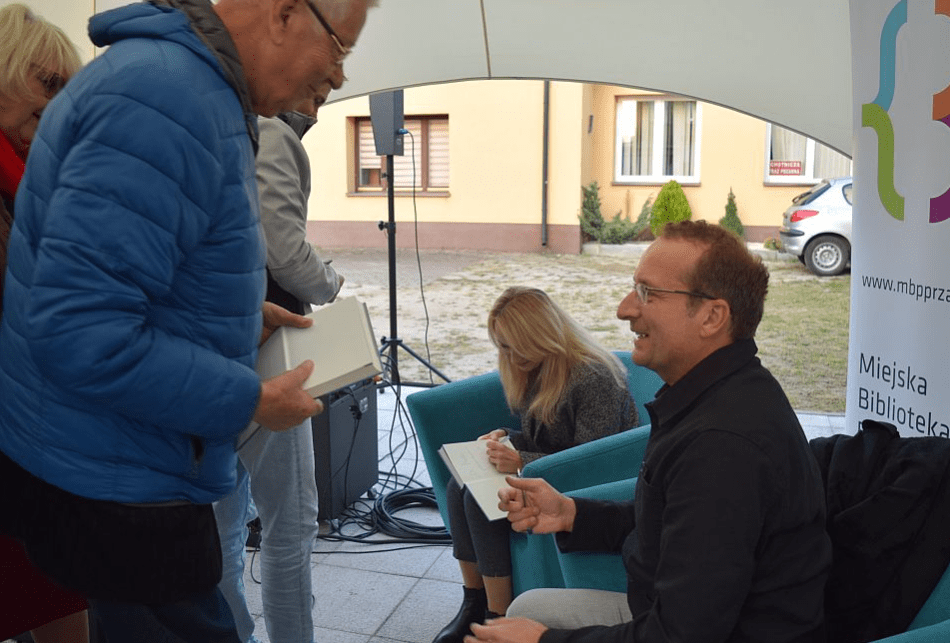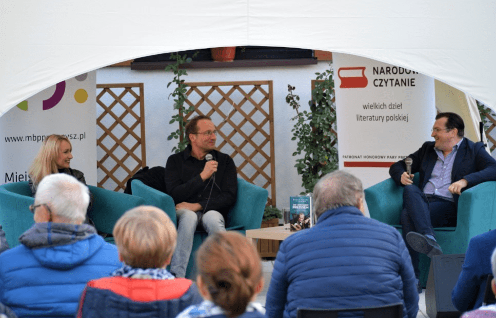 W plenerze, w czytelni letniej biblioteki gościliśmy: Roberta Górskiego – artystę kabaretowego, komika, satyryka, lidera i autora tekstów Kabaretu Moralnego Niepokoju, scenarzystę i odtwórcę głównej roli w serialu „Ucho Prezesa” i Monikę Sobień – Górską: dziennikarkę, a także scenarzystkę i pisarkę.