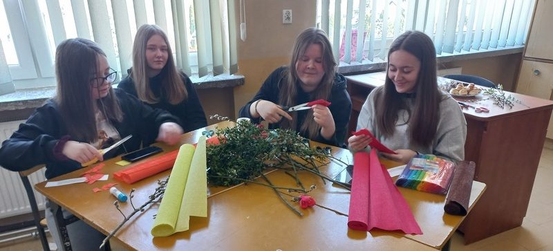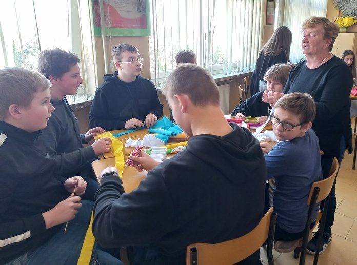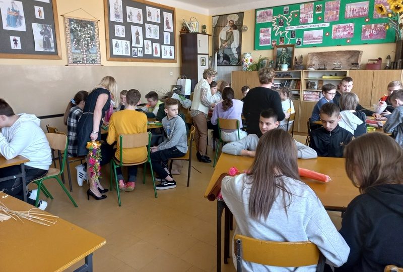 23 marca uczniowie klasy VII b i VIII a wraz z wychowawczyniami wzięli udział w warsztatach, podczas których wykonywali wielkanocne palmy. Głównym celem zajęć było przypomnienie tradycji związanych z przygotowaniami i obchodami świąt Wielkanocnych, a także nauka wykonania wielkanocnych palm.
