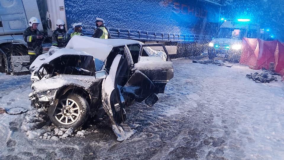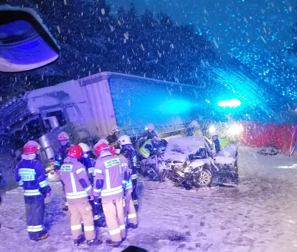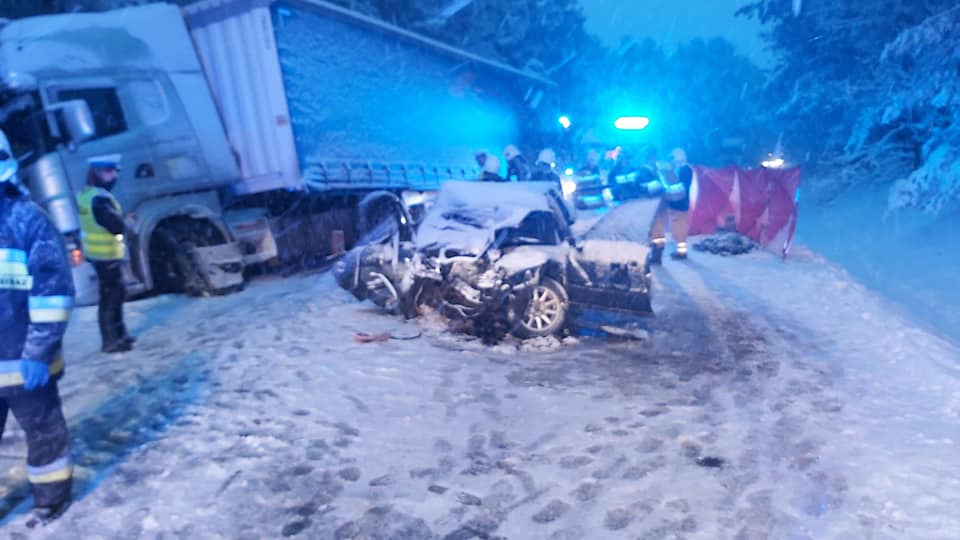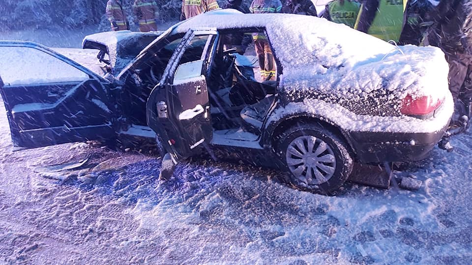 Kierowca osobowego audi stracił panowanie na pojazdem, następnie zjechał na przeciwległy pas ruchu u zderzył się czołowo z ciężarową Scanią. Osobowym audi podróżowało 5 osób