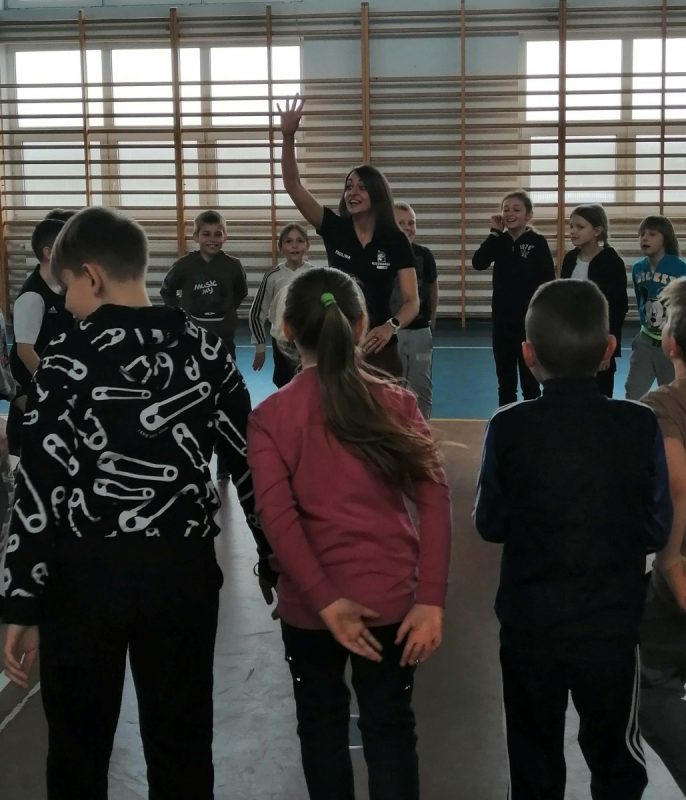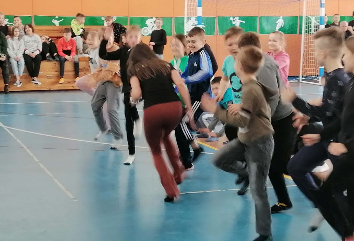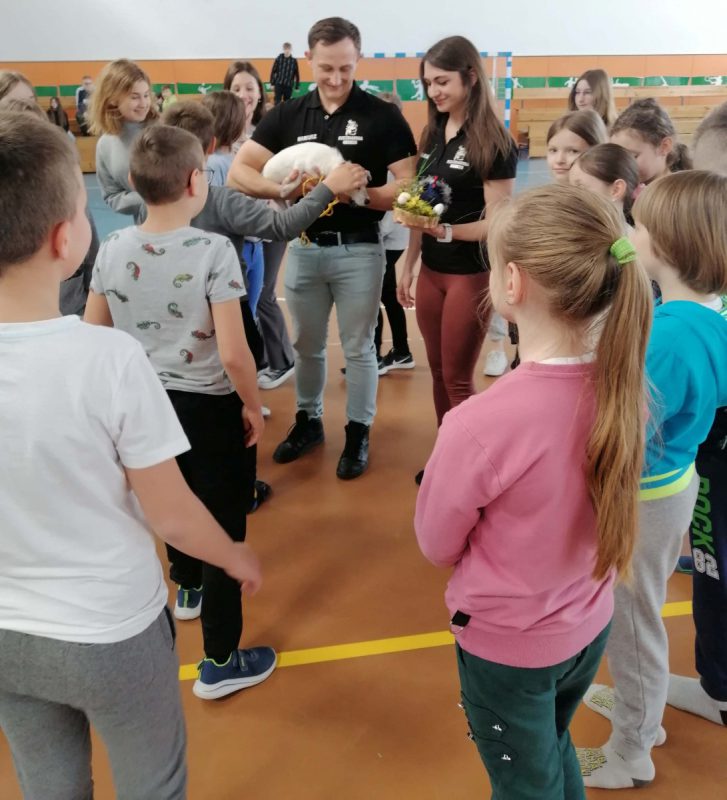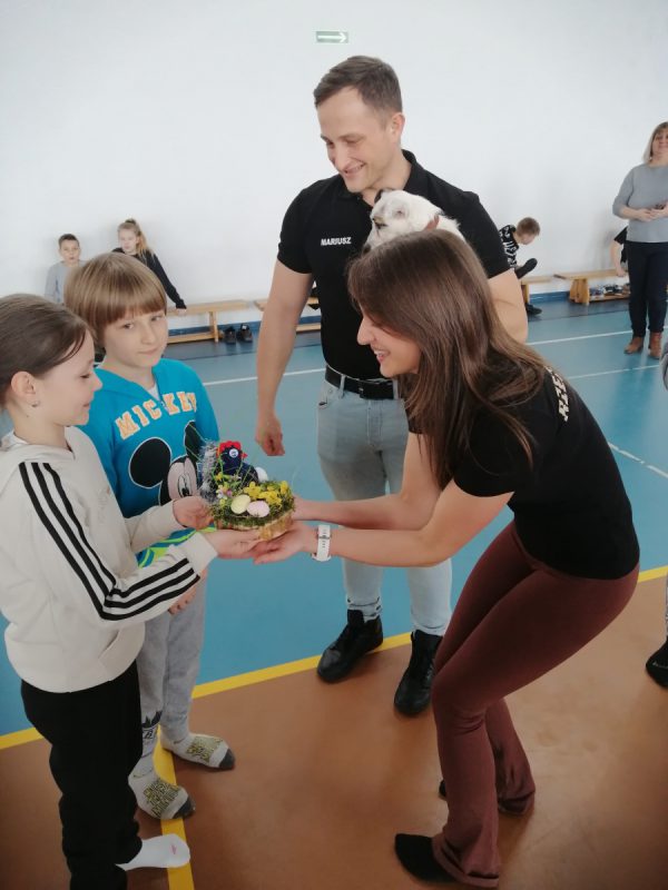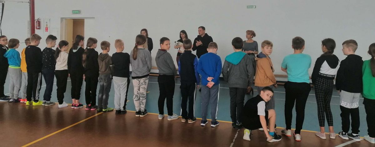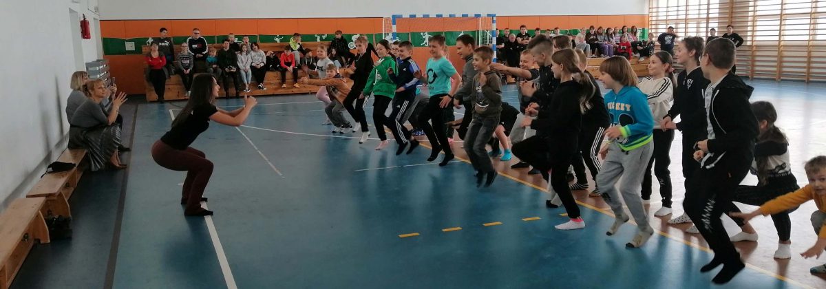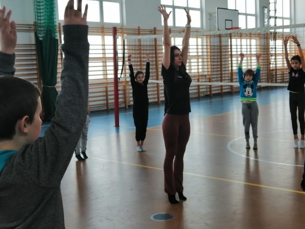 W drugiej części spotkania Paulina Jurczyńska przeprowadziła zajęcia gimnastyczne dla uczniów klas trzecich. Głównym celem zajęć była profilaktyka wad postawy wywołanych przez złe nawyki np. siedzący tryb życia, czy brak odpowiedniej dawki ruchu. Uczniowie ćwiczyli bardzo intensywnie, a zaangażowanie w zajęcia wypływające z naturalnej potrzeby ruchu, spełniło oczekiwania Trenerki. Paulina podsumowała, że uczniowie zasługują na piątkę z plusem z zajęć wychowania fizycznego.